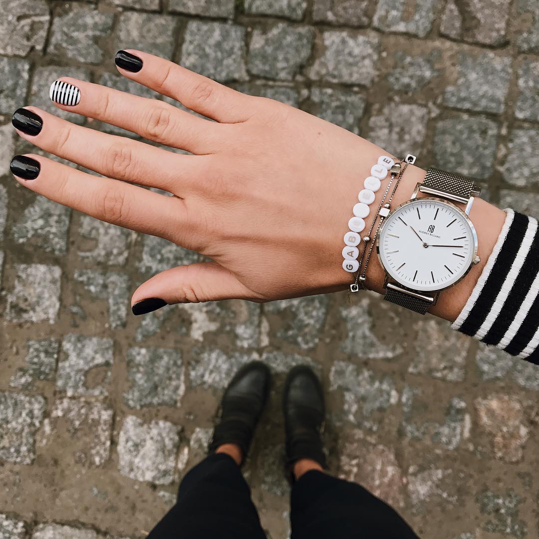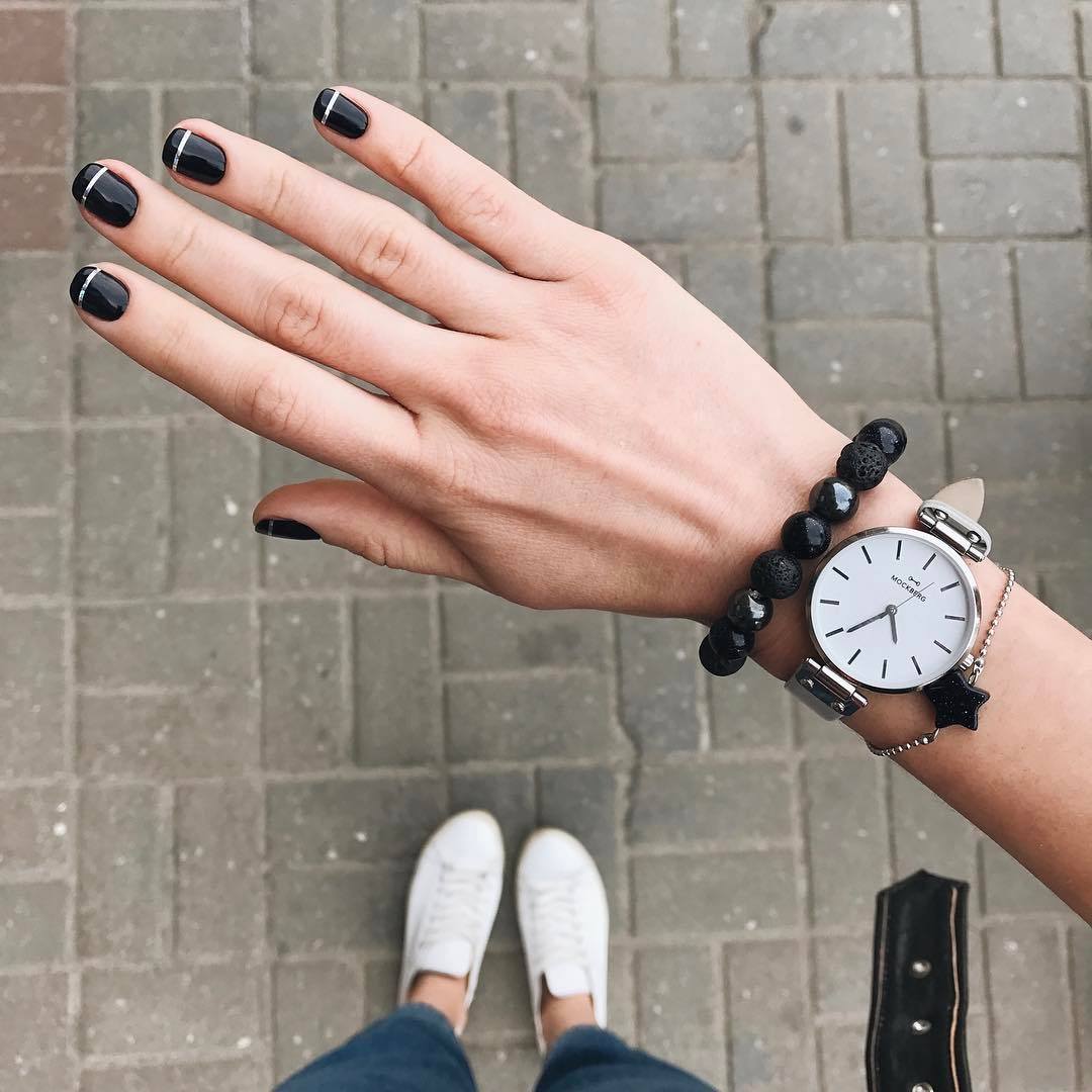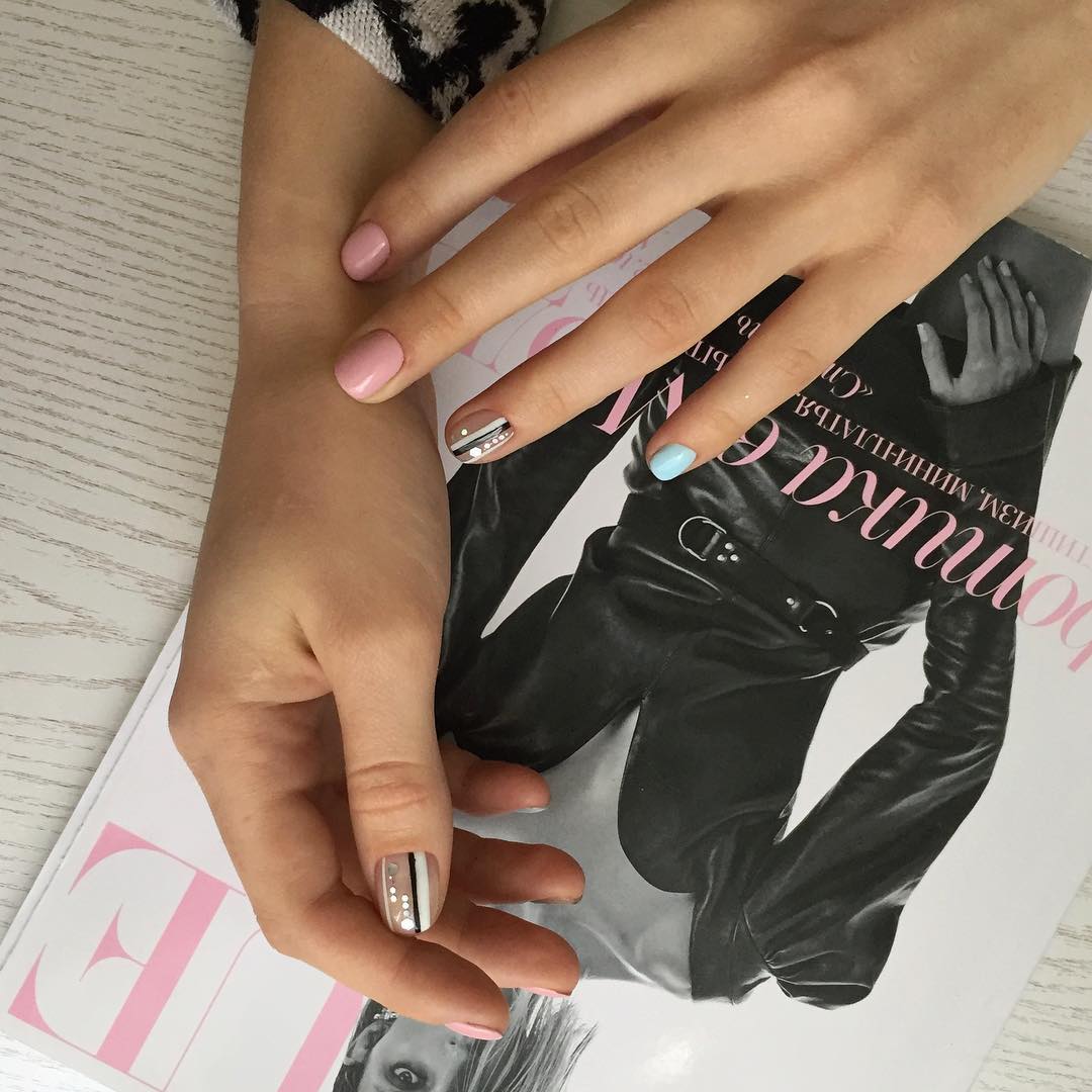 К примеру, в этом году в моде естественность во всем. То есть нейтральные оттенки, такие как белый, бежевый, серый, темно-синий и черный особенно актуальны. Они отлично сочетаются между собой как в одежде, так и в дизайне ногтей. Часто можно увидеть маникюр с базовым светлым оттенком и контрастными полосками. При желании их можно дополнить стразами или другим декором.