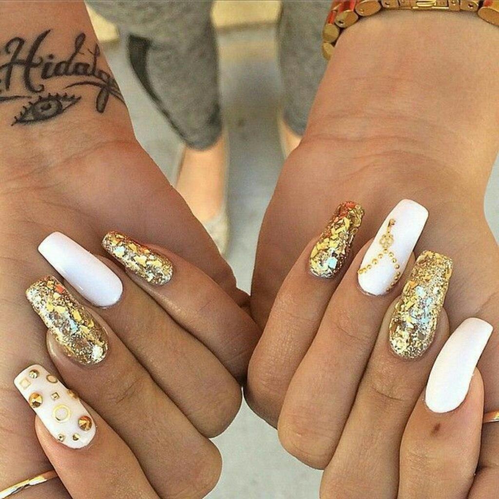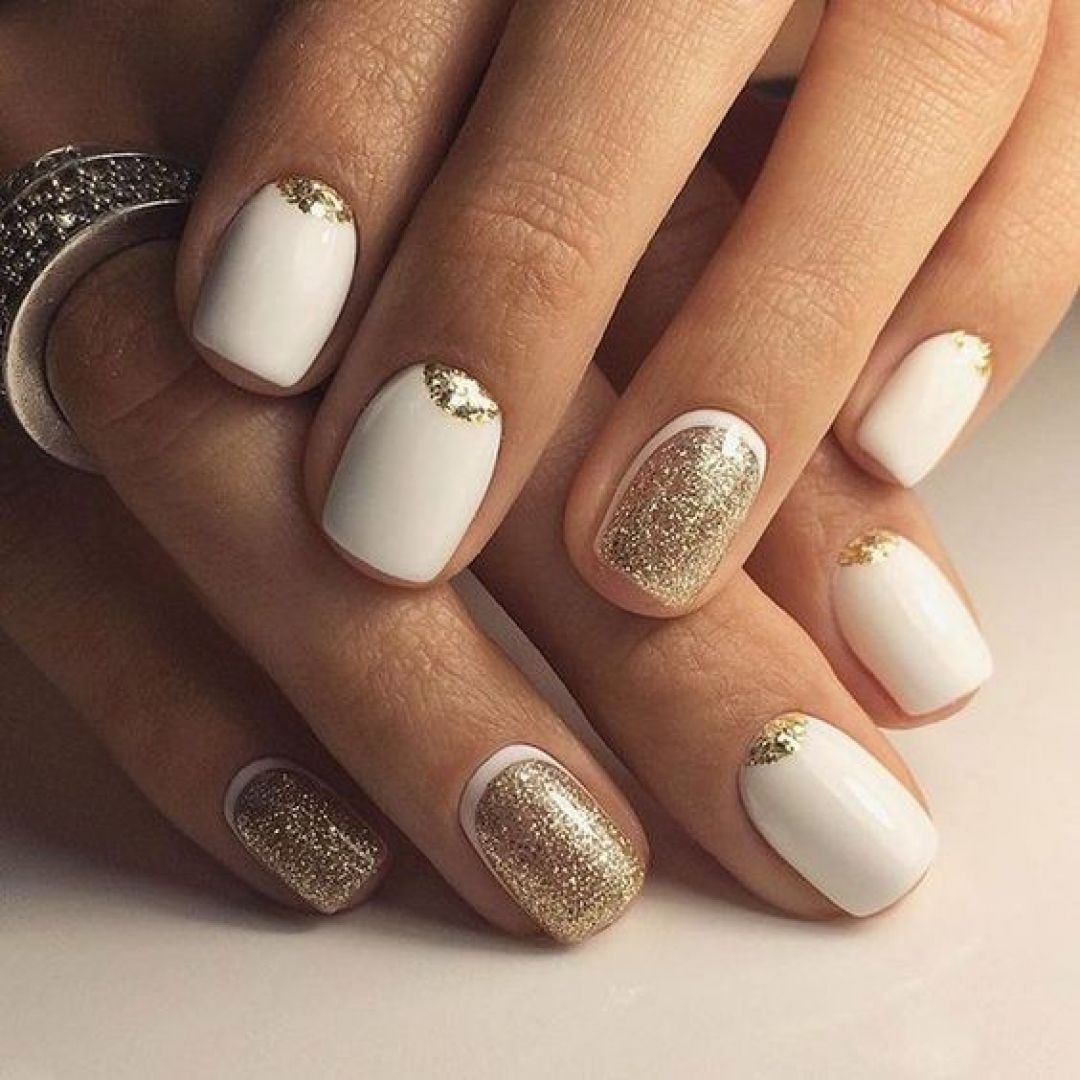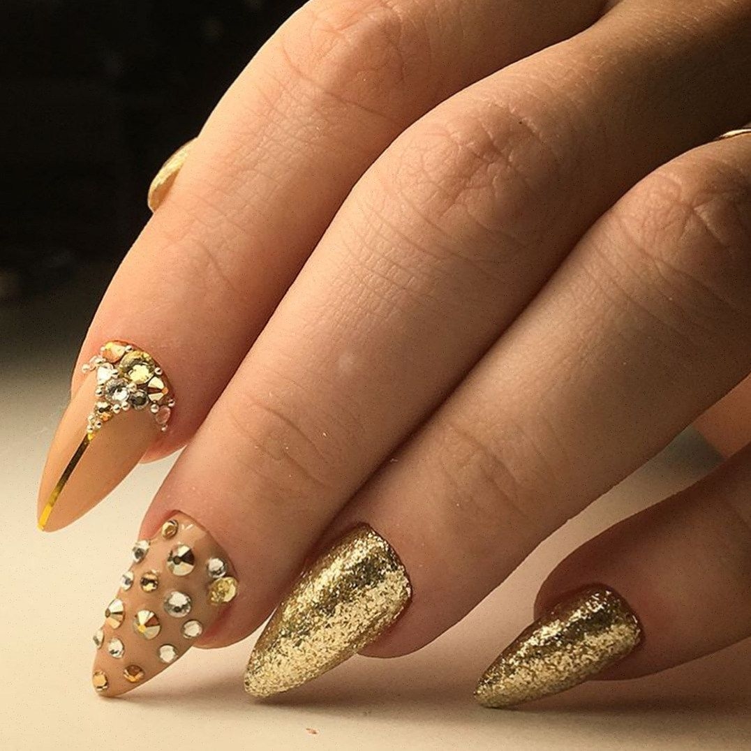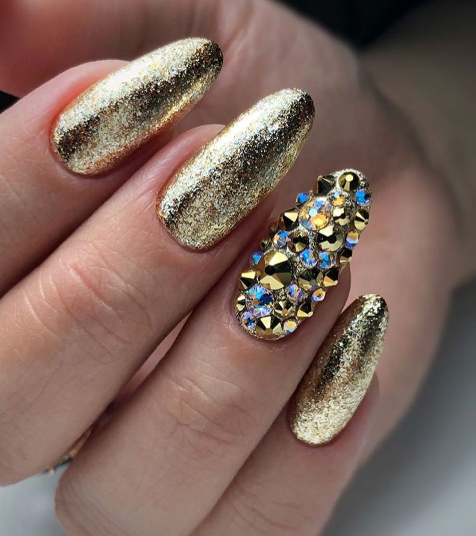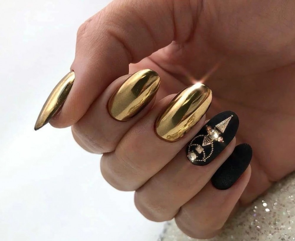 В этом сезоне стилисты и нейл-мастера рекомендуют выбирать ногти овальной либо миндалевидной формы и не отдавать предпочтение слишком большой длине ногтей. Здесь доступно множество вариаций дизайна: от минимализма и геометрии до блесток и камней. Золотое украшение для ногтей отлично смотрится на большой длине ногтей, это может быть дизайн с применением фольги, блесток, камней. Французский маникюр и лунный дизайн ногтей стали ведущими в этом сезоне. Такие решения в сочетании с золотом легко создать с помощью золотого глиттера. Для украшения ногтевой пластины также можно использовать камни, стразы и блестки.