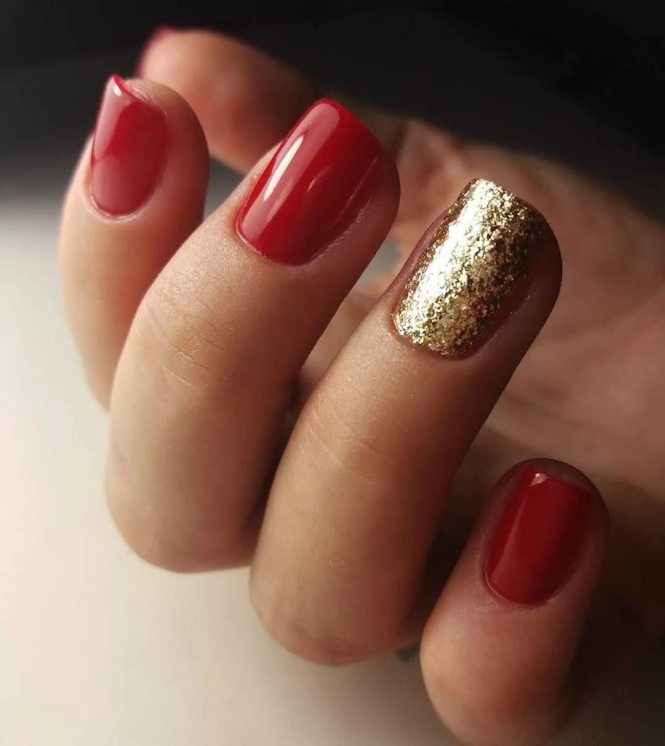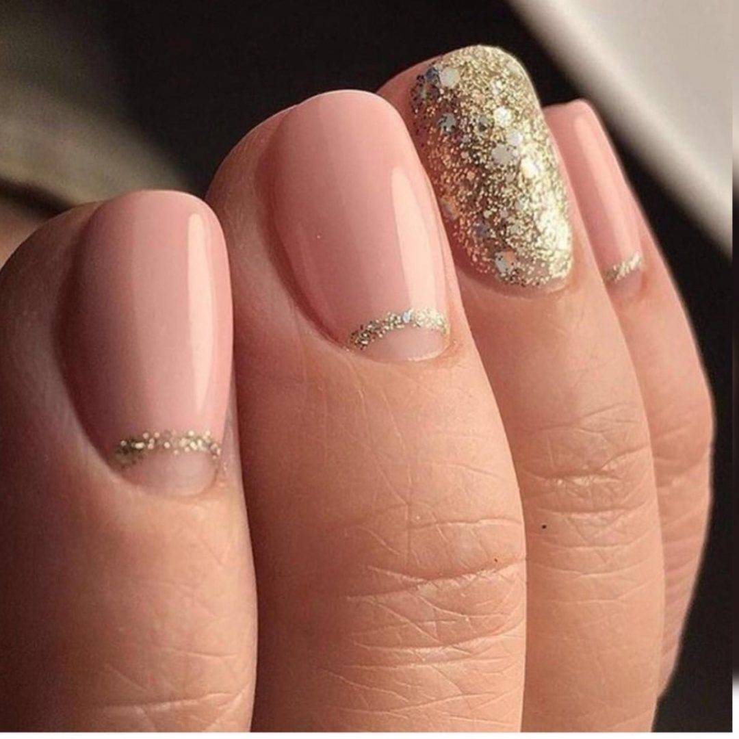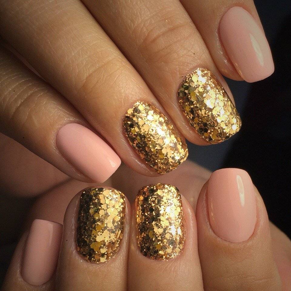 - Акцент. Покрываем ногтевую пластину основным цветом с глянцевым или матовым финишем и делаем акцент на 1-2 пальцах – золотистое покрытие с шиммером или глиттером. Такое оформление – прекрасный выбор для праздников.