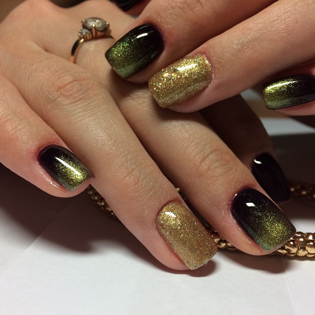 Оформление ногтей в зеленом цвете с золотым может быть выполнено в следующих вариантах: