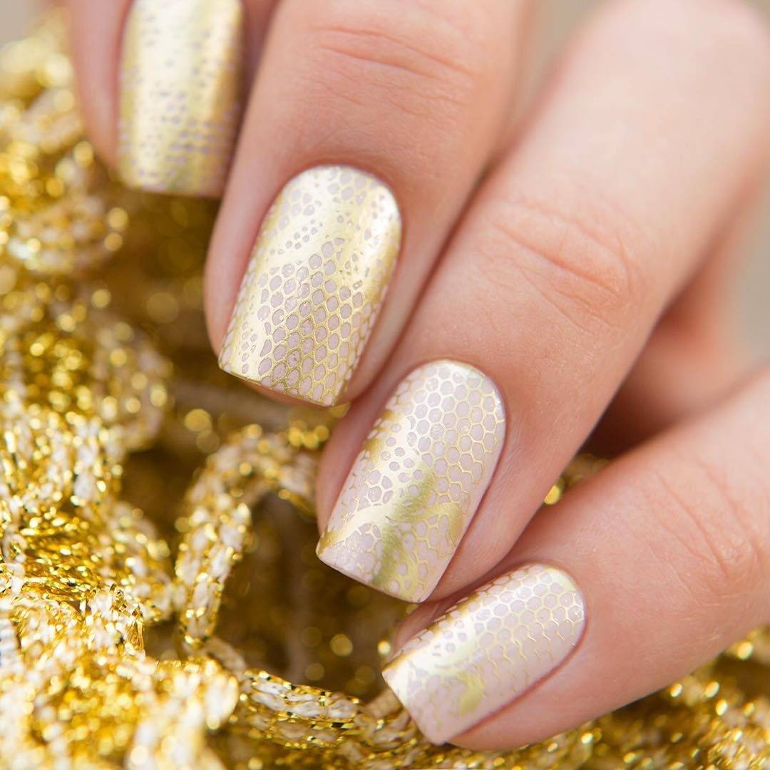 Если необходимо добиться равномерного покрытия, следует выбирать лаки с мелким шиммером. Также золото может иметь лаконичное или зеркальное воплощение. Профессиональные линейки включают в себя экземпляры с эффектом фольги, шелка или песка. Если вы хотите сделать простой золотой маникюр в домашних условиях, советуем приобрести твердое покрытие в виде наклеек – с ним легко работать, результат будет выглядеть довольно опрятно.
