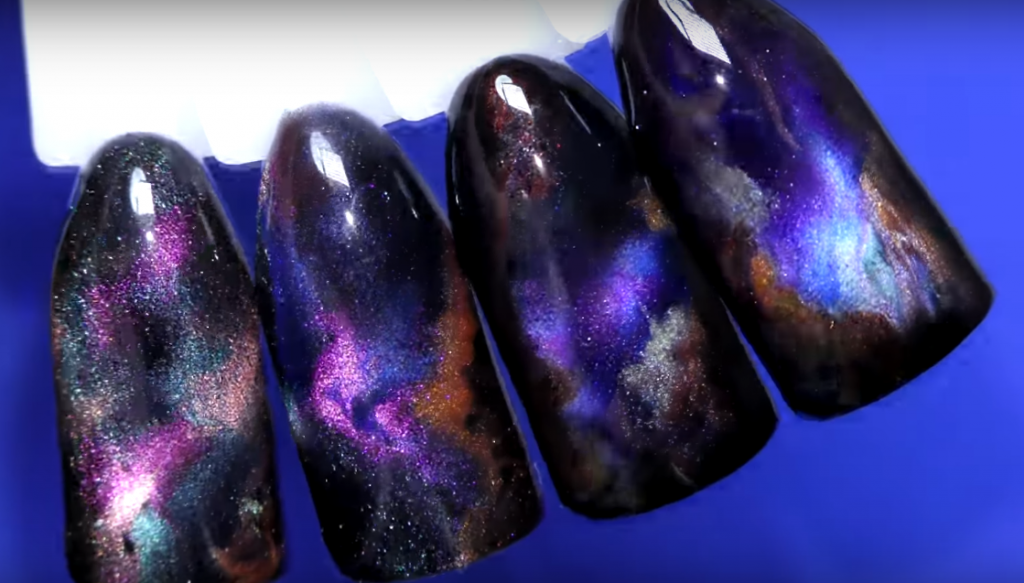 Сочетание разноцветных лаков с блестками дает необычный космический эффект. Подобный дизайн для начинающих можно увидеть на фото.