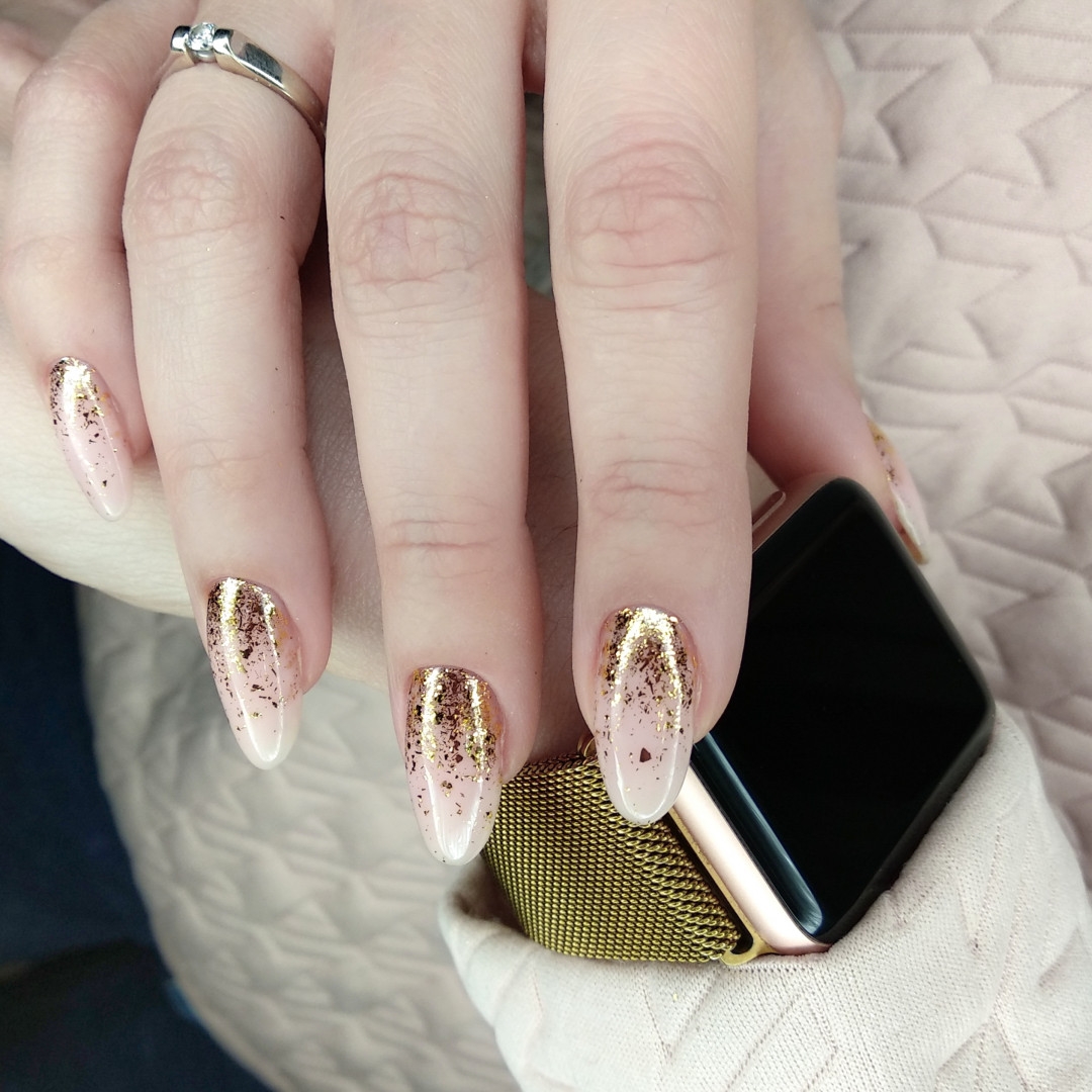 По-своему интересный и востребованный материал для нейл-арта. Его используют, аккуратно выкладывая отдельные частички при помощи маникюрной кисти. Такое решение поможет создавать даже рисунки золотом на маникюре. Труд кропотливый, но оно того стоит.