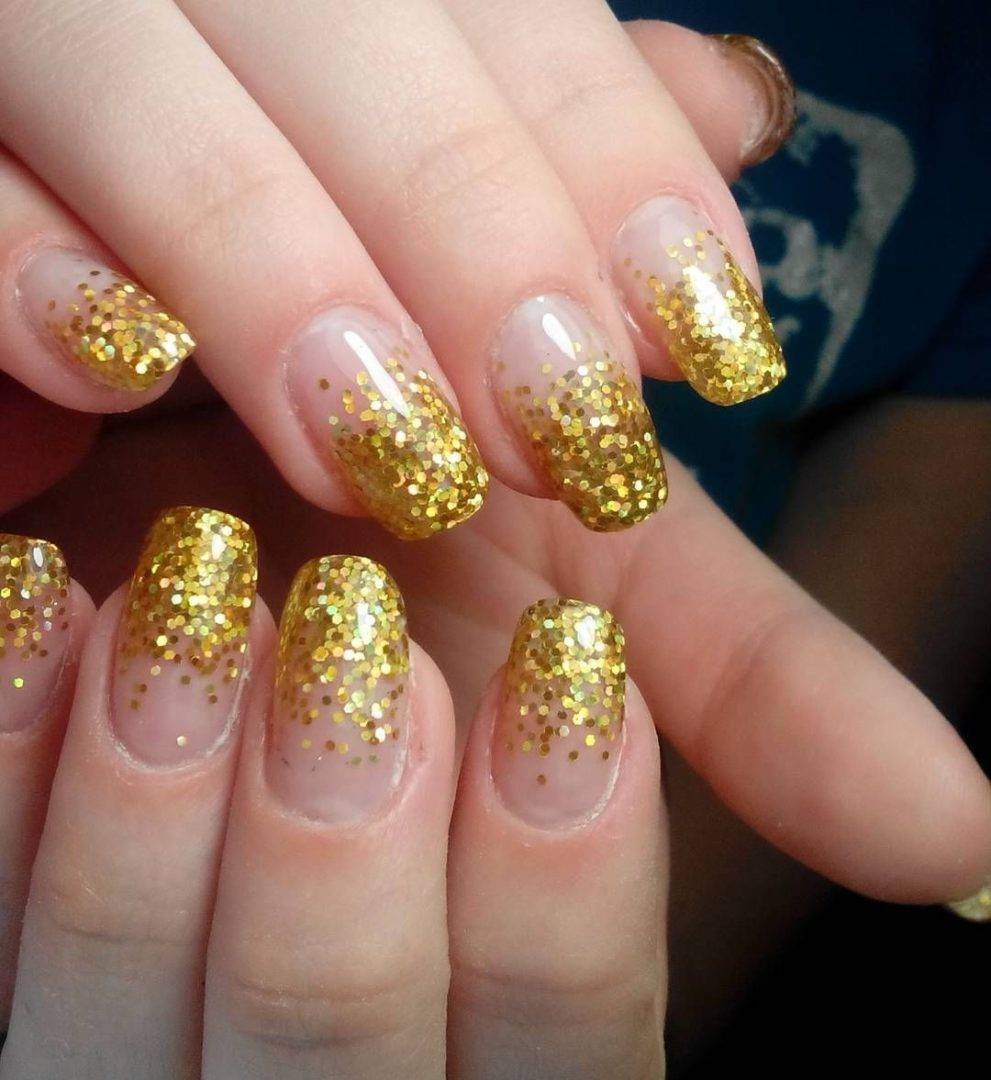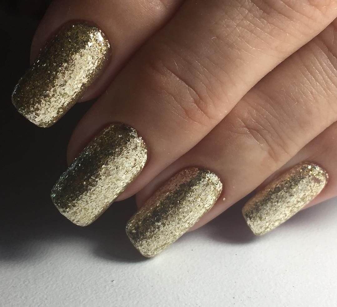 Ноготки, украшенные золотым глиттером, притягивают взгляд, поэтому важно, чтобы и кожа рук выглядела безупречно. Будут явно выделяться даже малые огрехи в виде заусенцев или отрастающей кутикулы, необходимо регулярно делать ванночки, массаж и ежедневно использовать питательный крем
