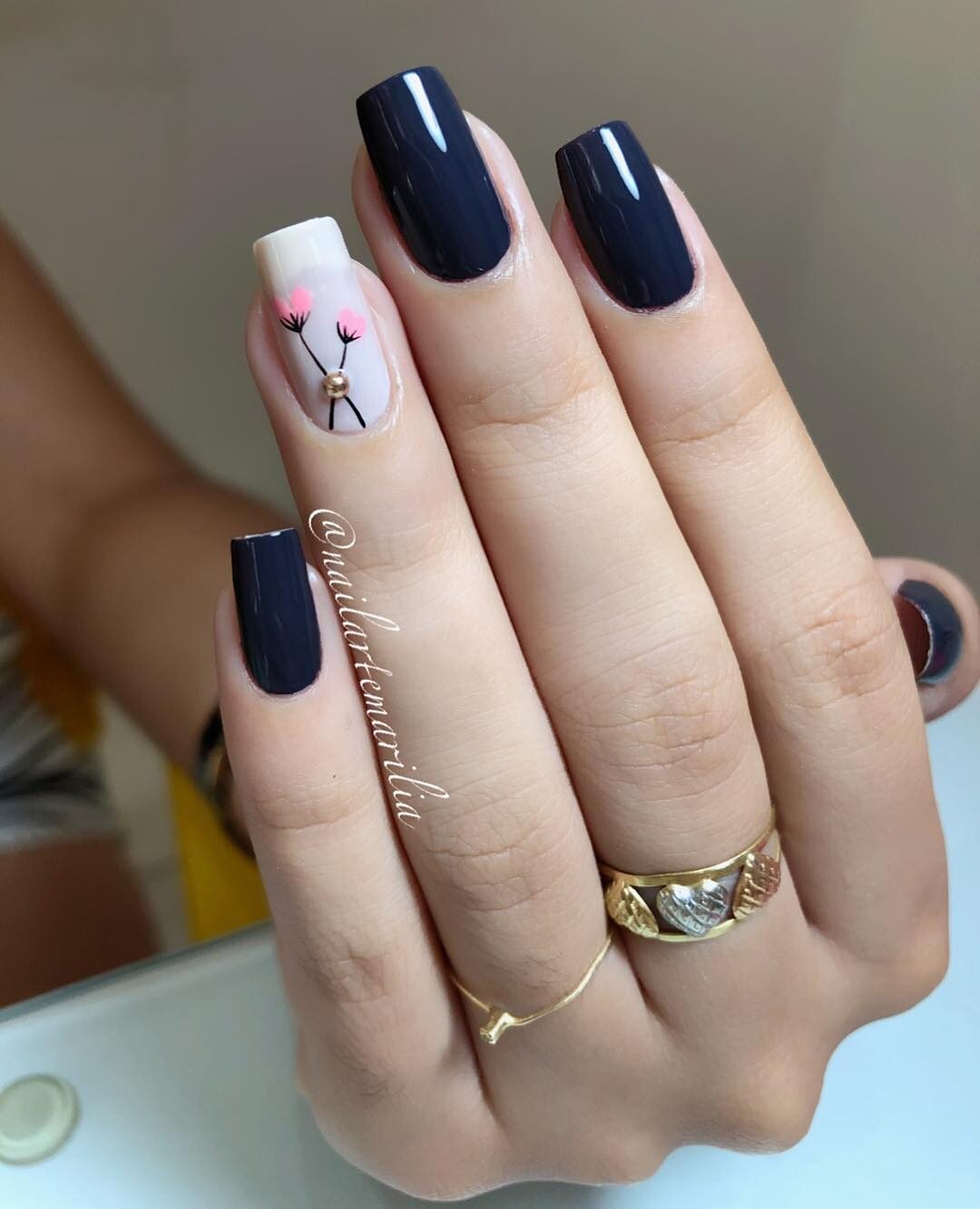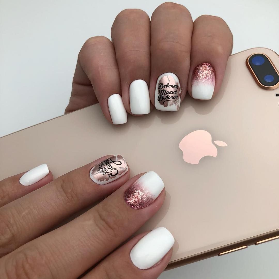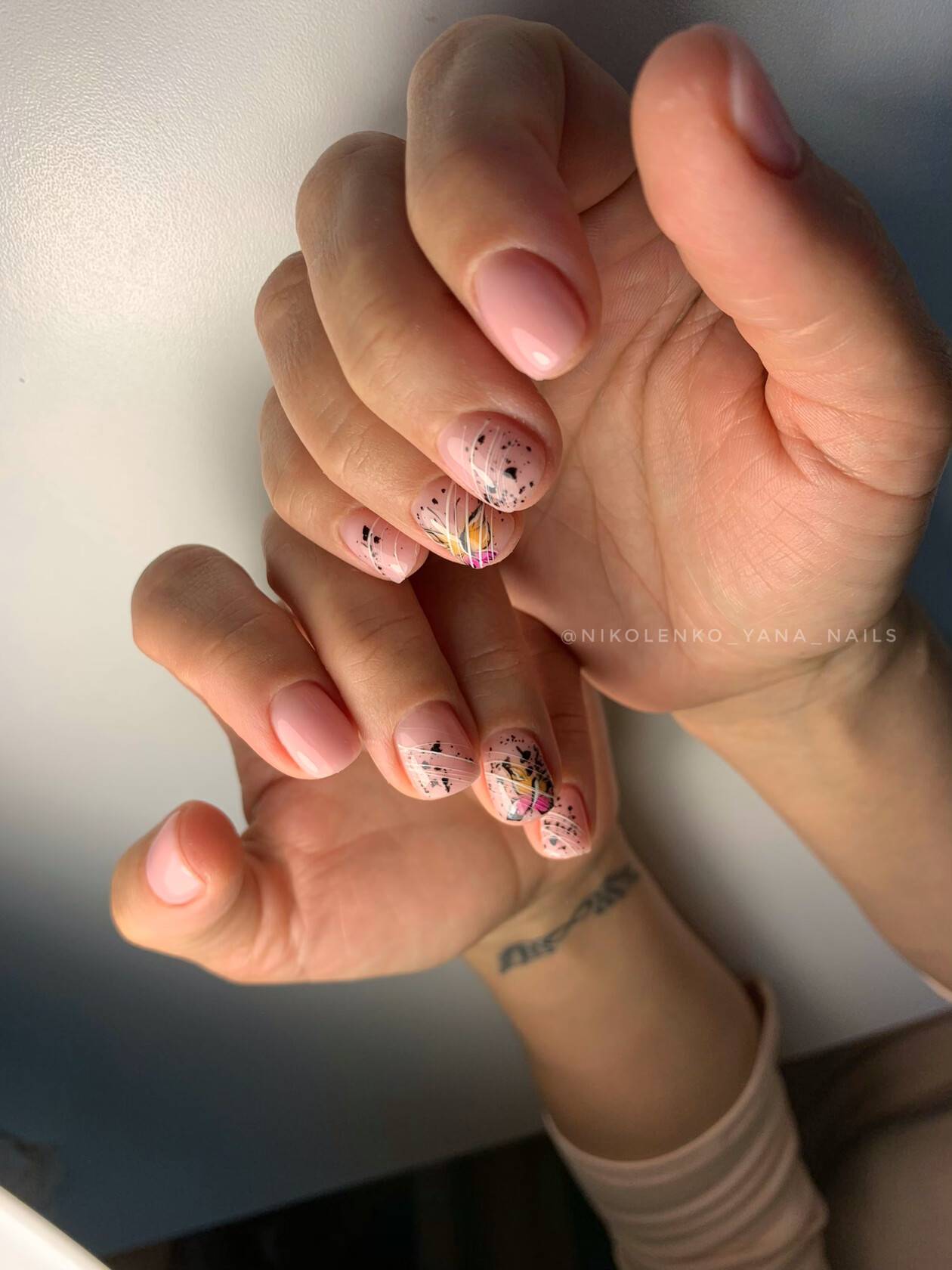 Маникюр натуральных оттенков служит идеальной базой для рисунков. Сейчас в тренде детские картинки в стиле «наив», графика, минимализм и различные надписи. Абсолютным же хитом на все времена являются цветочные мотивы. Но, если раньше это были сложные акварельные рисунки, то в этом году лучше придерживаться принципа «чем проще, тем лучше».