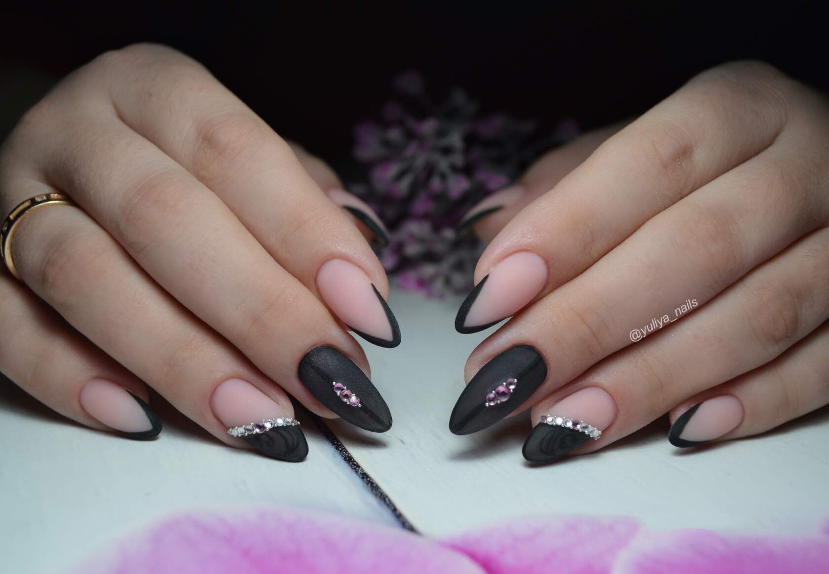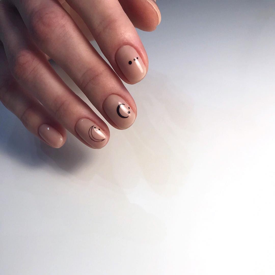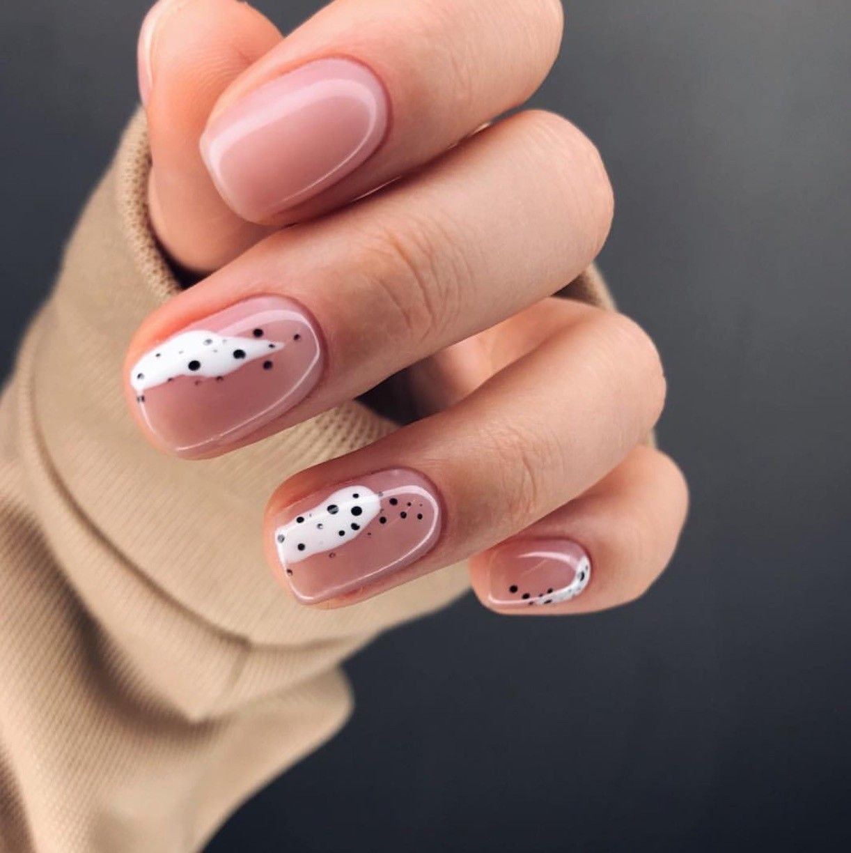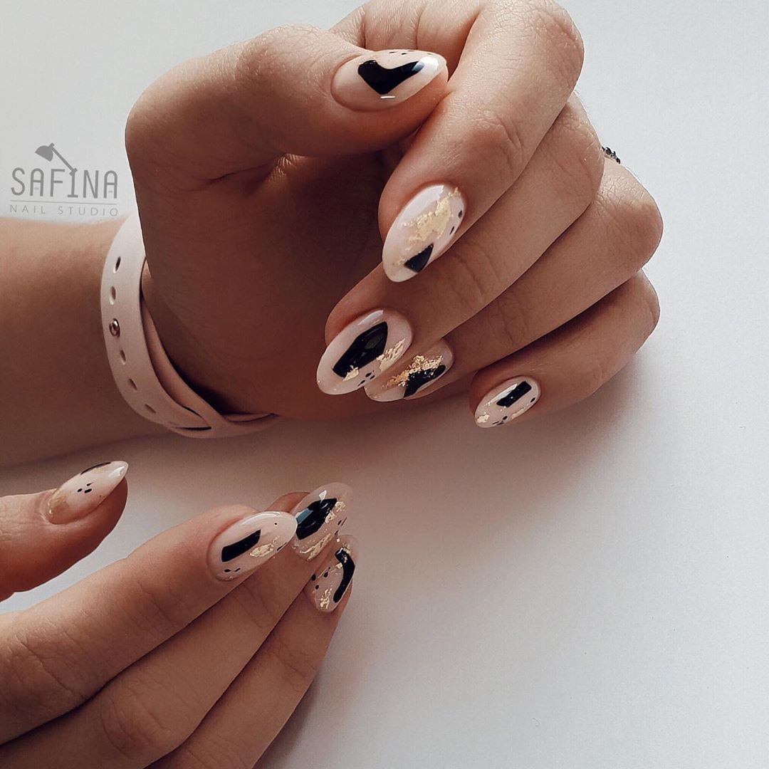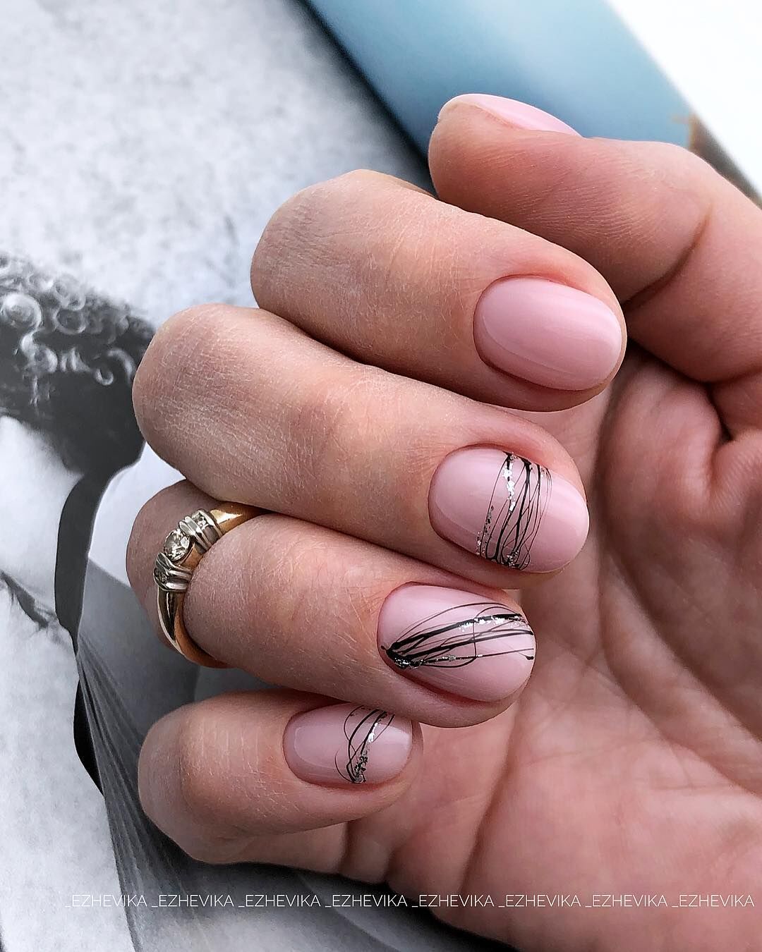 Элементы черного цвета красиво оттеняют натуральные ногти и создают графический акцент, с помощью которого можно зрительно вытянуть форму. Так как сейчас в тренде минимализм, лучше всего изобразить тонкие линии, точки и хаотичные узоры гелем-паутинкой.