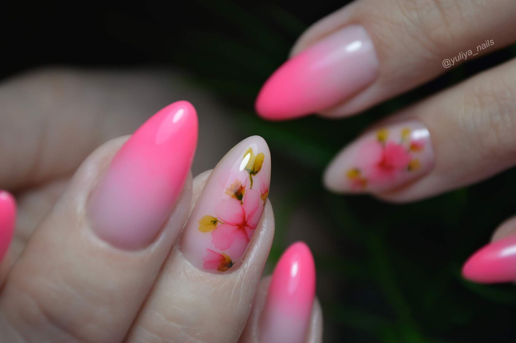 Особенно эффектно такой нейл-арт смотрится на френче, когда декор выполнен только на кончиках. Кроме того, для аквариумного дизайна можно использовать крошечные сухоцветы — натуральные материалы смотрятся изысканнее и дороже.