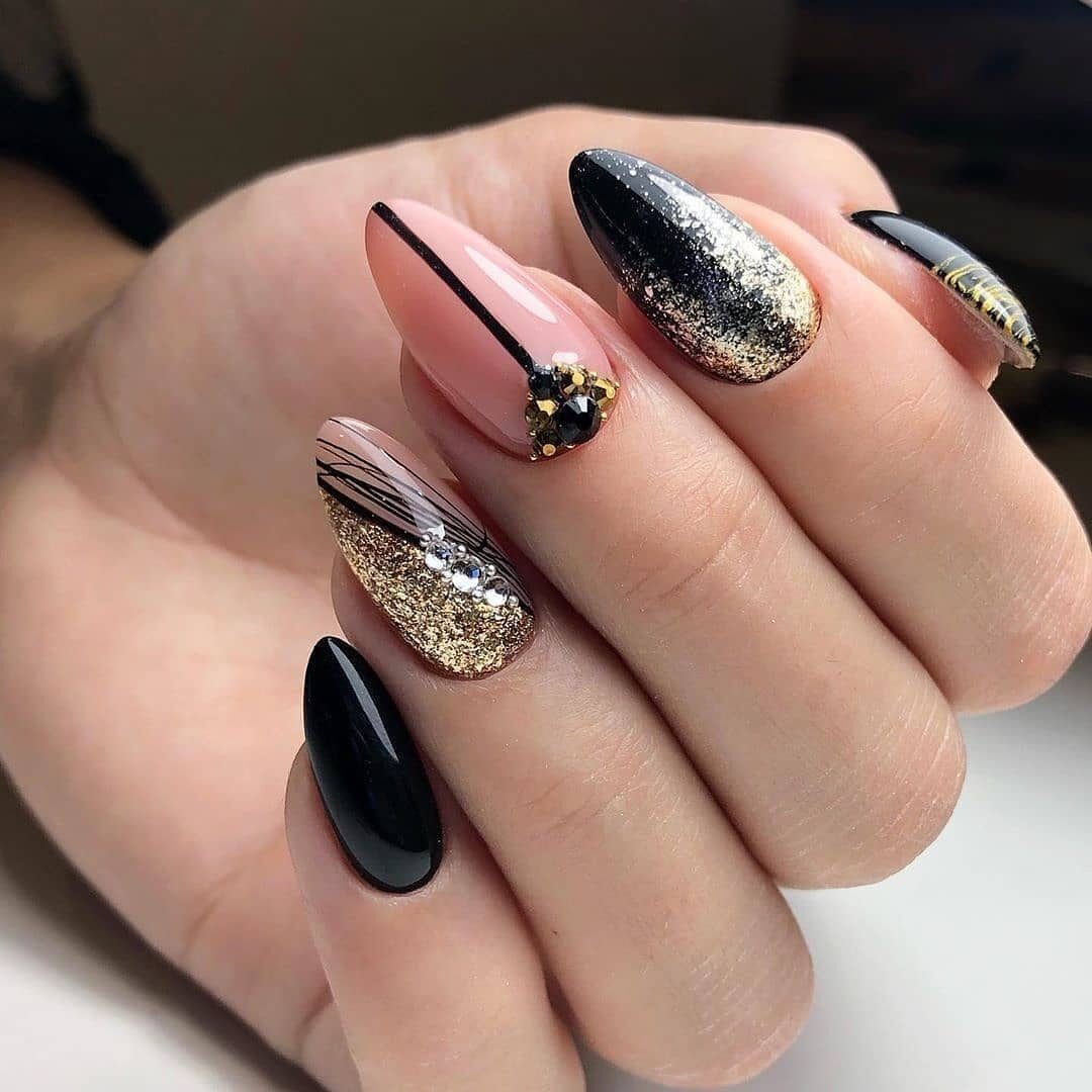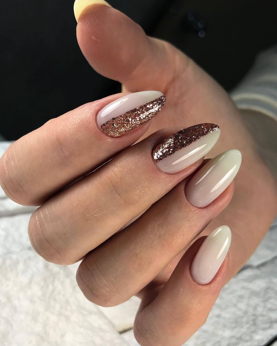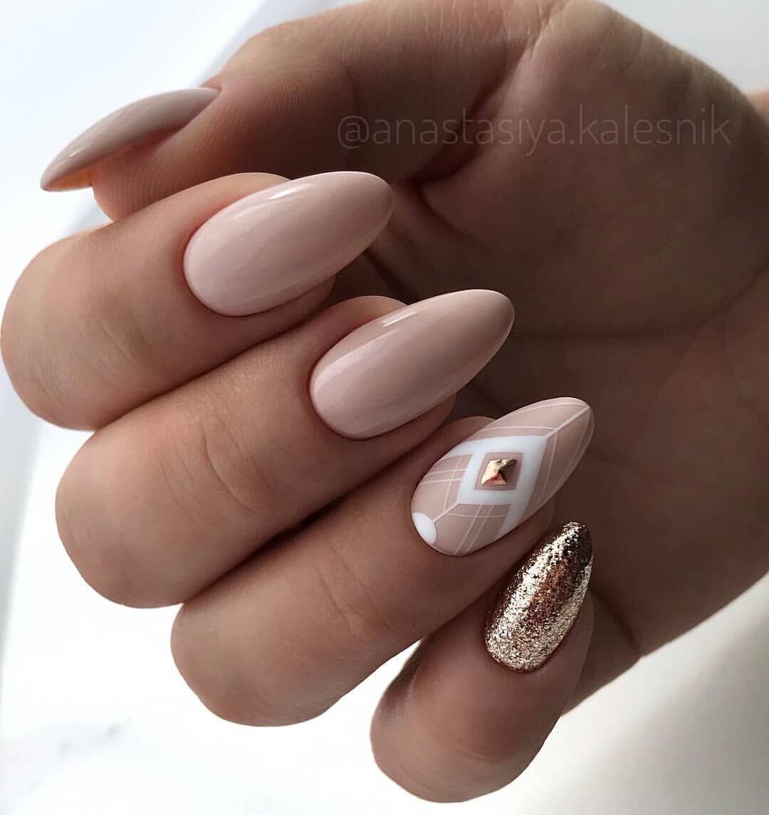 В этом сезоне отдавайте предпочтение миндалевидной форме ногтей, такая форма выглядит очень утончено и стильно. Дизайн ногтей на миндалевидную форму шикарно выглядит и в темных и в светлых оттенках, ярких и пастельных, с блестками, камнями и фольгой, с втиркой и наклейками.