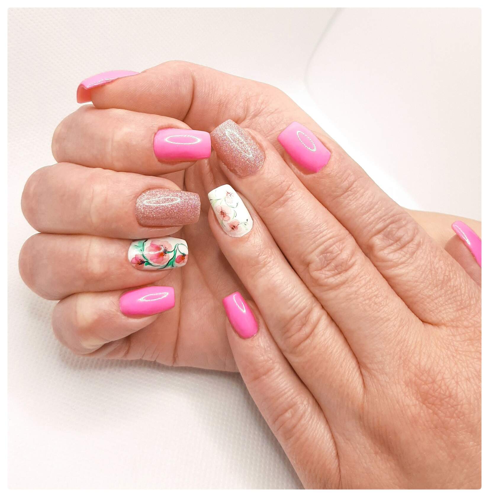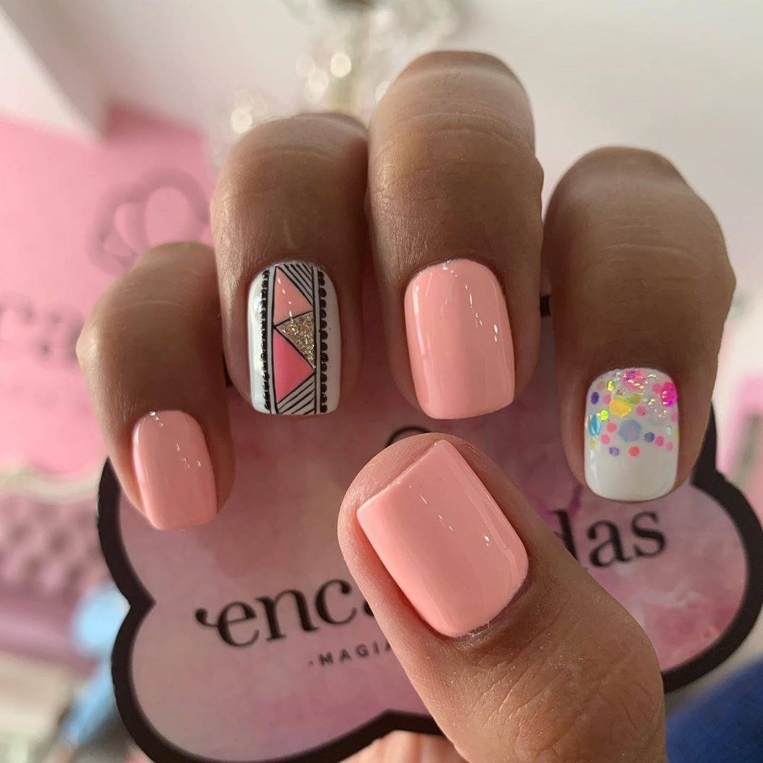 В качестве весеннего маникюра можно использовать также пастельный розовый или персиковый гель как основу. На нем белым лаком рисуют мелкие цветы, можно использовать стразы, но не слишком объемные.