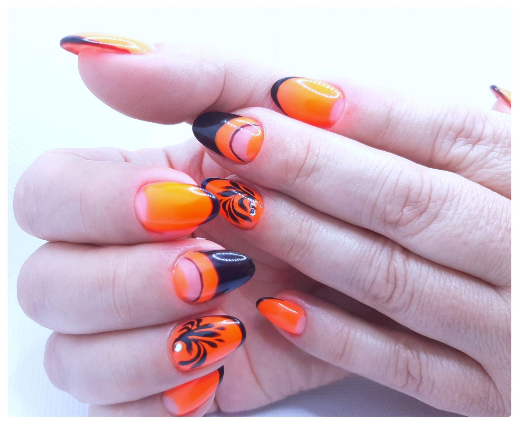 Весьма привлекателен ноготь, окрашенный ярким лаком с кончиком на пару тонов темнее. Не менее оригинальный вариант — ноготь темного цвета с белой полоской на кончике.