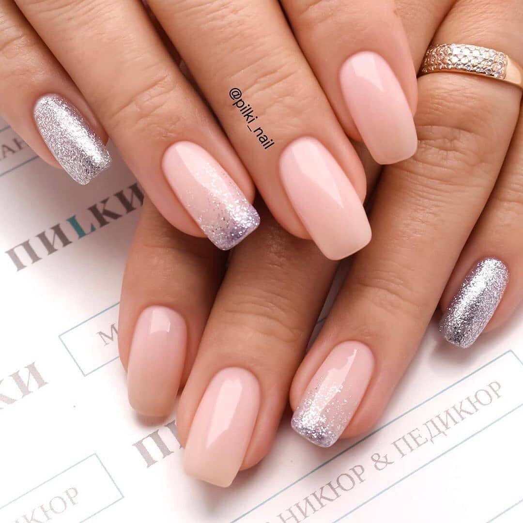 Помимо бежевого нюда, в создании дизайна ногтей с натуральными оттенками, часто используются светло – розовый. Это может быть как «чистый» цвет, так и лак с мелким шиммером. Такой вариант маникюра создает перламутровое сияние, деликатно переливаясь на свету. Кроме того, пудровые оттенки розового прекрасно сочетаются со всеми видами нейл-дизайна.