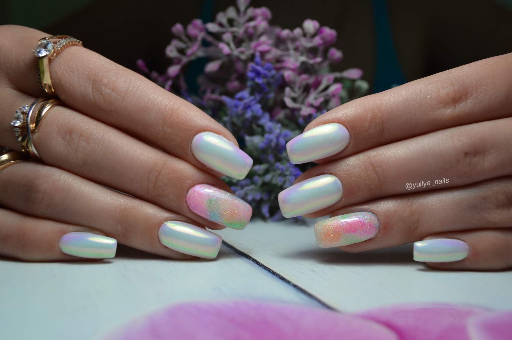 Данный вид маникюра достиг пика популярности. Благодаря многообразию видов втирок создаются различные дизайны: от трогательного до интригующего. Особенно привлекательно этот дизайн смотрится на длинных ногтях. Сверкающий блеск визуально расширяет пластину коротких ногтей, что является решающим аргументом в пользу выбора данного дизайна.