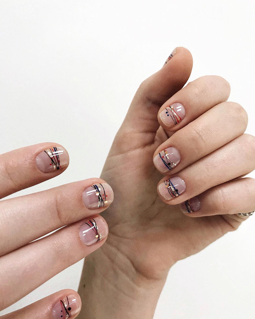 Не стоит использовать ни слишком крупные, ни слишком мелкие декоративные элементы. Дабы маникюр не был чересчур пестрым, выбирайте 2-3 цветовых оттенка, избегая объемного дизайна. Также стоит учесть, что модный маникюр на короткие ногти не приемлет блесток, особенно в огромном количестве.