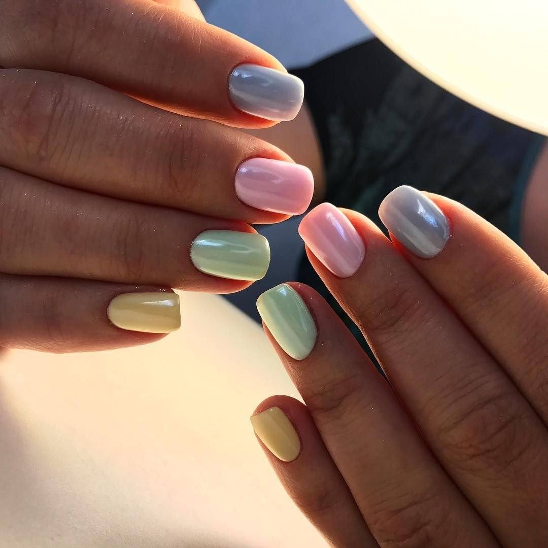 Этот тип маникюра идеально смотрится на ногтях одинаковой формы и длины. Можно все ногти одной руки накрасить разным лаком, но цвета должны сочетаться.