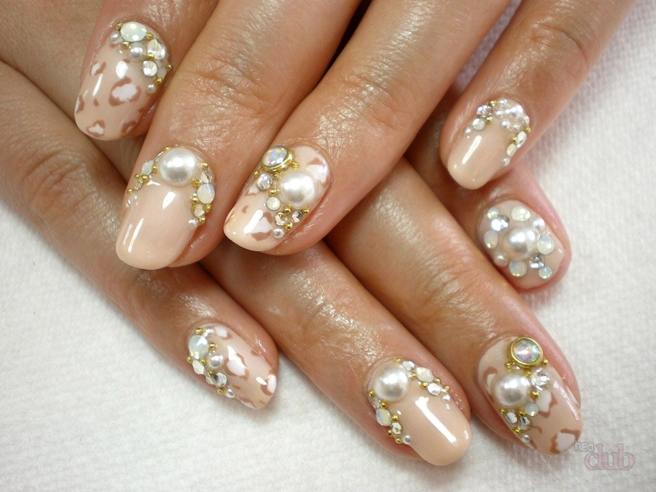 Если вы поклонница стиля минимализм, выбирайте для базы однотонные нюдовые оттенки лака. На них можно создавать целые картины стразами или размещать по одному два камешка у основания (лунулы), края пластины, в самой ее середине.