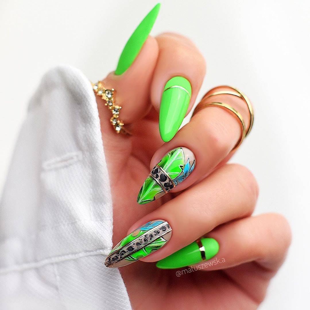 При этом важно не переборщить, дизайн должен быть заранее продуман и желательно апробирован на типсах. На острых ногтях отлично смотрится дизайн с втиркой, градиентом, меланжем. Не исключены нейл-арты в лимонном, оранжевом, ярко-зеленом цветах