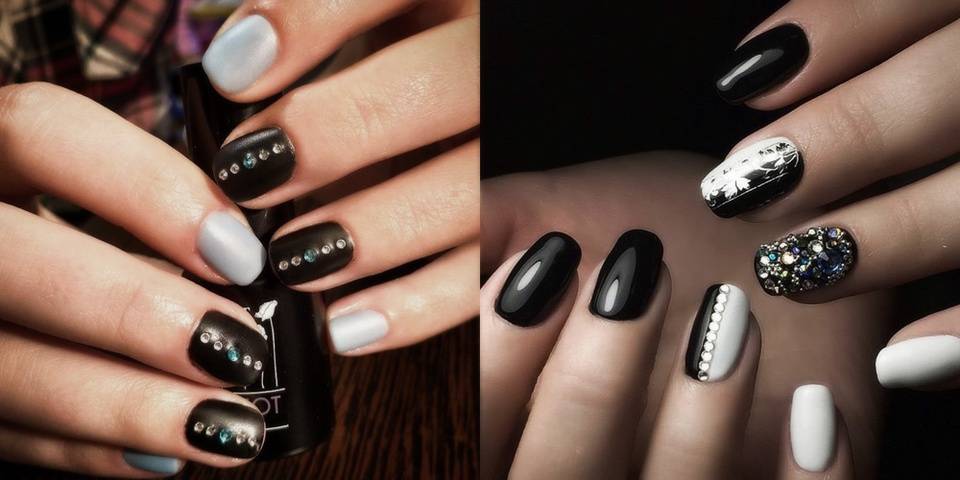 Если вы фанатка декора со стразами, обязательно сделайте черный маникюр. Он выгодно оттеняет блеск камней и декор будет заметным, не потеряется на фоне яркого цвета. Рекомендуем сочетать камни с матовой текстурой, чтобы они солировали в дизайне.
