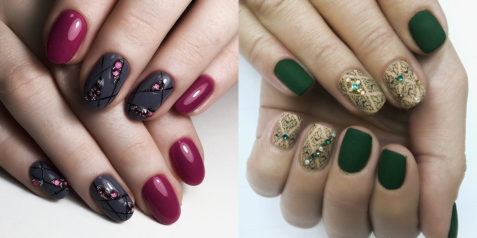На длинных ногтях стразы идеально сочетаются со светлым лаком. Если предпочтение отдается темным оттенкам, следует использовать матовый топ.