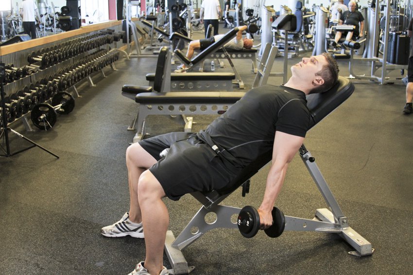 | Подъём гантелей на бицепс хватом «молот» на наклонной скамье | 4 подхода по 12 повторений | |