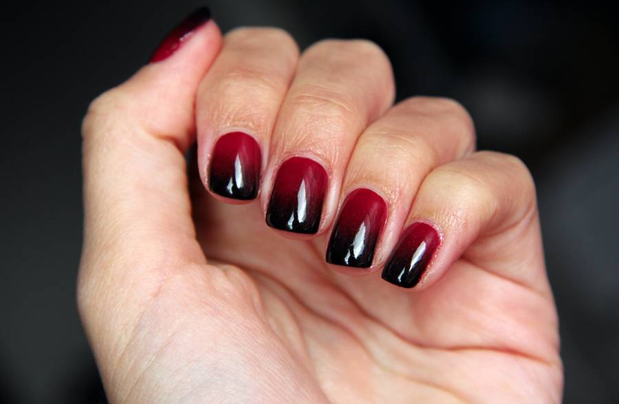 Сначала ногтевая пластина покрывается лаком-базой. Цветные лаки наносятся сначала на поверхность пластиковой крышки или пленки линиями, смешиваются, а после рисунок быстро отпечатывается с помощью губки на ногтевой пластины. Чтобы сделать переход от темного на кончике к светлому в лунке оттенку, нужно сначала покрыть весь ноготок светлым лаком, а уже потом второй цвет отпечатывается губкой на верхней части.