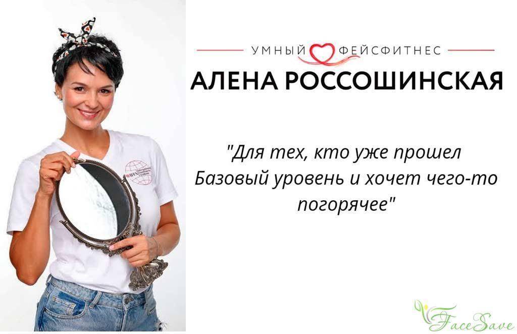 Алёна Россошинская — остеопат и фитнес-тренер, известна как учредитель проекта I love facefitness (сайт), ведущая на телеканале «ЖиВи». Прежде чем начать серьёзную деятельность девушка изучала азы физической подготовки и спорта, окончив Одесский Национальный Университет физического воспитания. А также большое влияние на совершенствование личности оказала ранее основанная методика Кэрол Мэджио. Автор бестселлера дала разрешение и официальный сертификат Алёне для дальнейшей деятельности — преподаванию системы упражнений для лицевых мышц. Алёна является основателем первой специализированной студии на Украине по фитнесу для лица FACE.FITNES.