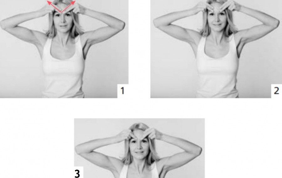 - Поднимайте брови вверх и одновременно оказывайте сопротивление ладонями, чтобы на лбу не образовывались поперечные морщины.