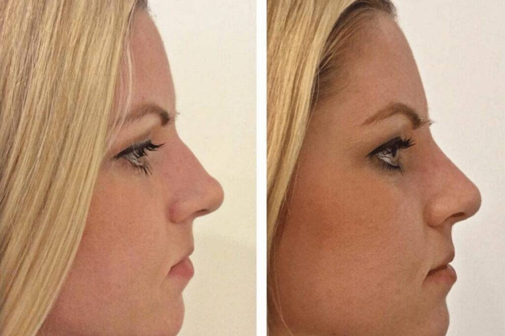 Филлеры – плотные наполнители, вводимые под кожу. Позволяют скорректировать небольшие недостатки – убрать асимметрию, неровности, впадины, горбинку, дефекты, возникшие после операции. Можно сузить нос или сделать шире его корень, изменить ширину спинки, подкорректировать контур, увеличить выпуклость, видоизменить колумеллу, приподнять кончик. Очень часто клиенты обращаются к косметологу, чтобы убрать небольшую горбинку. Для этого филлеры вводятся над ней и под, таким образом переход становится более плавным. Филлеры позволяют сделать спинку абсолютно прямой, убрать кривизну.