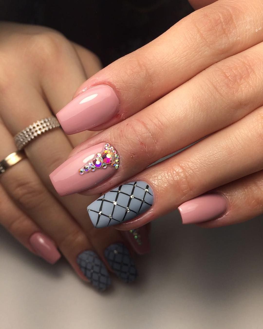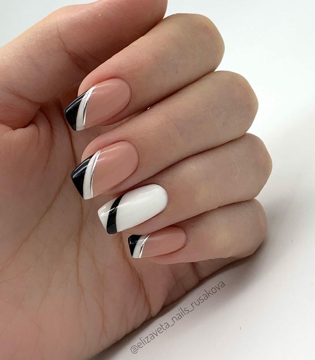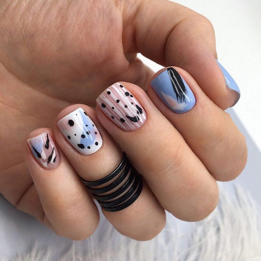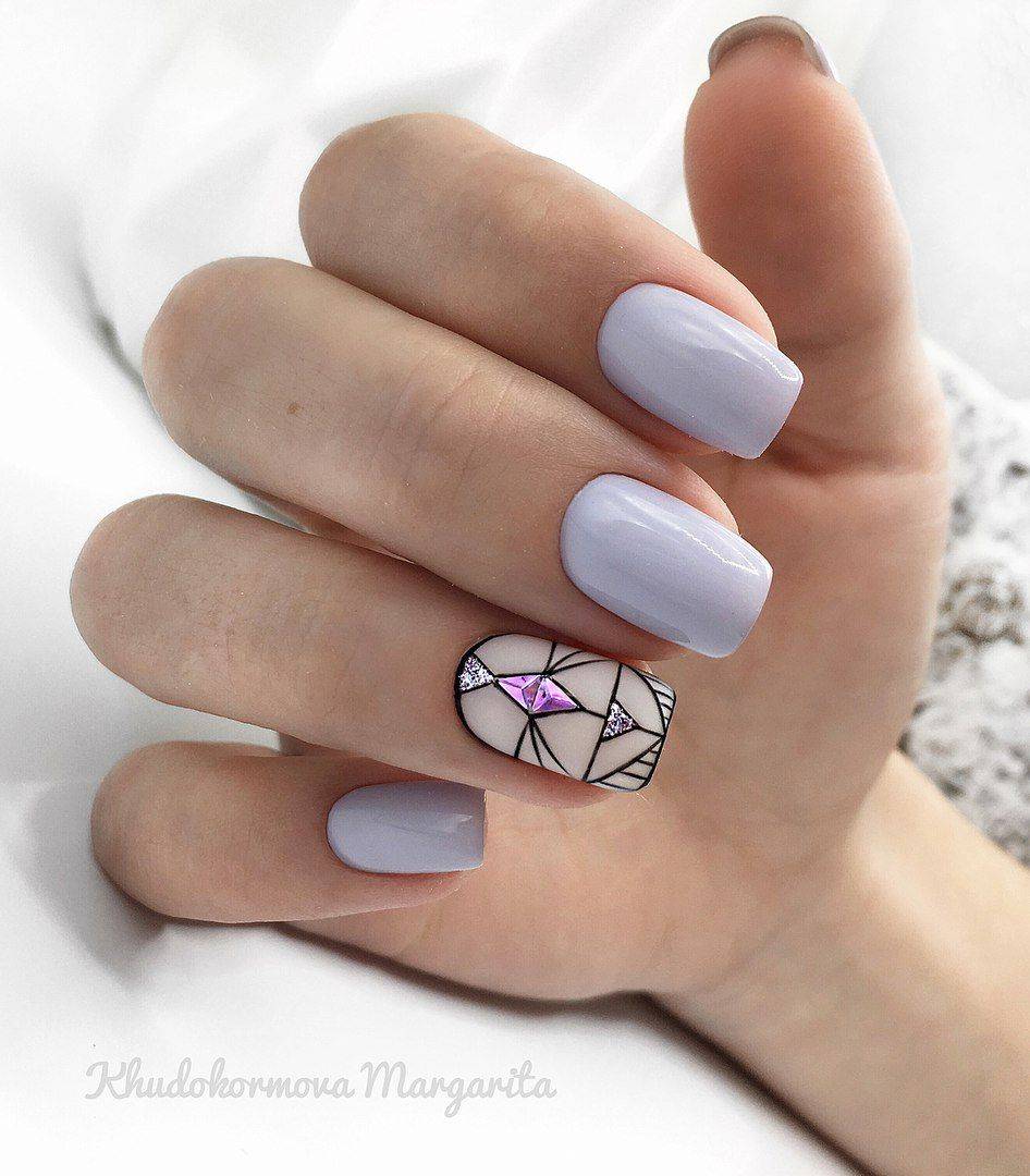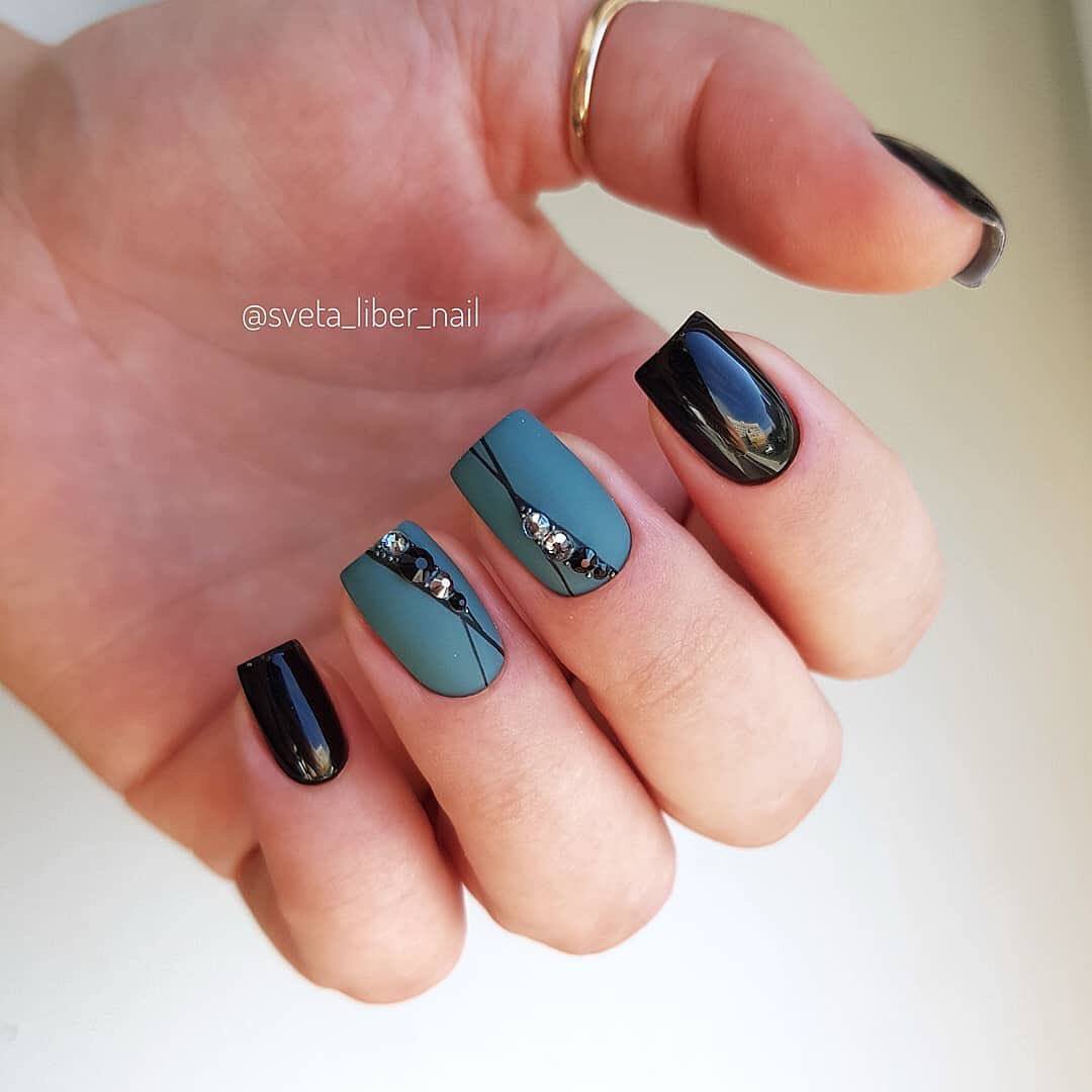 Как мы уже упоминали выше, геометрические фигуры отлично смотрятся на квадратных ногтях. ВЫ можете выбрать между множеством линий, цветов и разных рисунков. Этим летом выбирайте черные линии и голубой лак для ногтей.