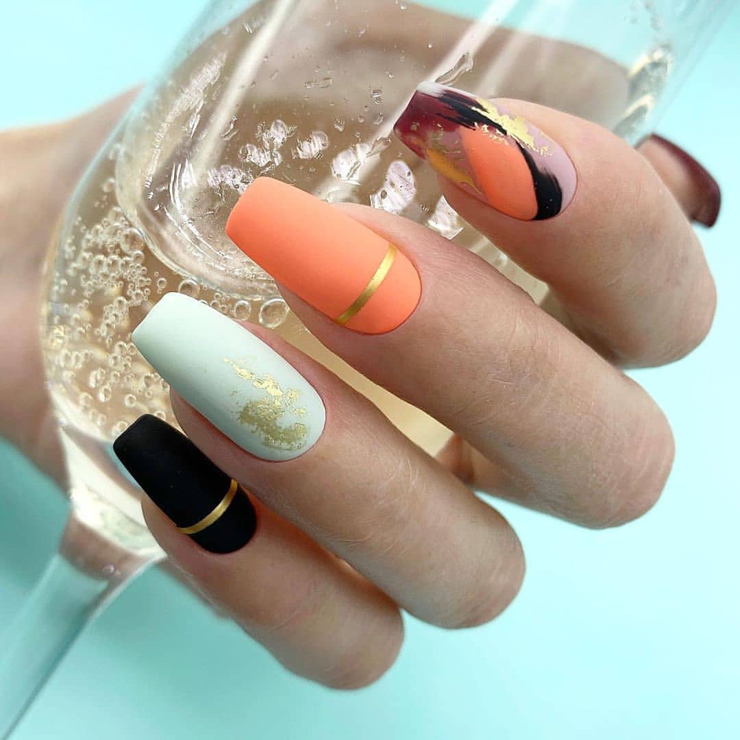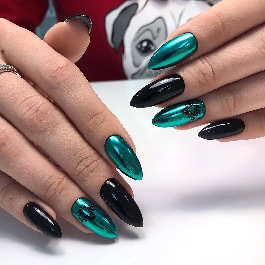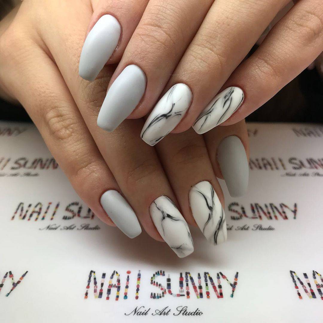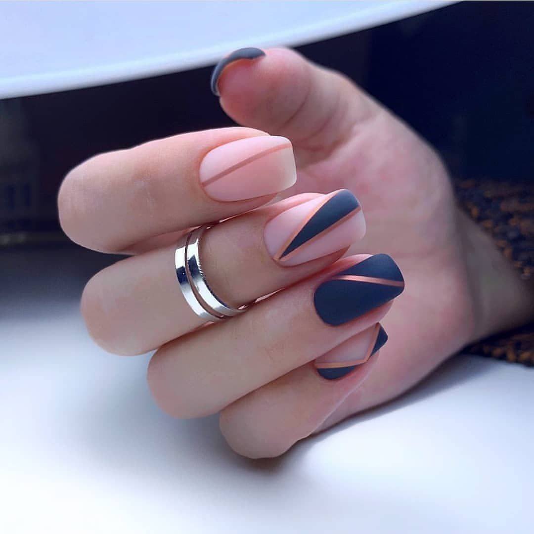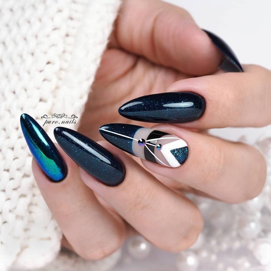 Как мы уже упоминали выше, геометрические фигуры отлично смотрятся на квадратных ногтях. ВЫ можете выбрать между множеством линий, цветов и разных рисунков. Этим летом выбирайте черные линии и голубой лак для ногтей.