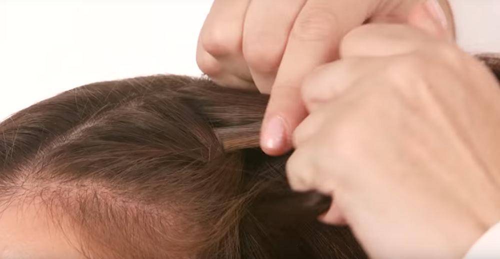 - Сбоку отделите от корней три равные пряди. Следите, чтобы волосы лежали по направлению ото лба и не распадались по бокам.