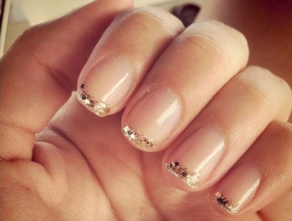 Сначала необходимо решить, будет ли использован светлый лак. Если да, то его необходимо нанести первым. Высушить основное покрытие подходящим способом. Нанести на кончики ногтей улыбку, но использовать не белый лак или цветной, а золотой шиммер или глиттер. Еще раз подсушить красивый френч на коротких ногтях. Зафиксировать при помощи прозрачного лака или топа