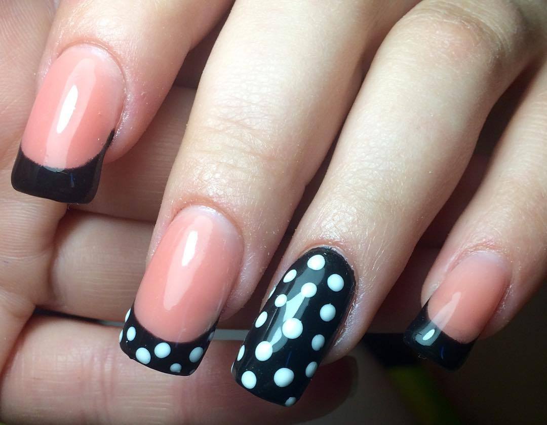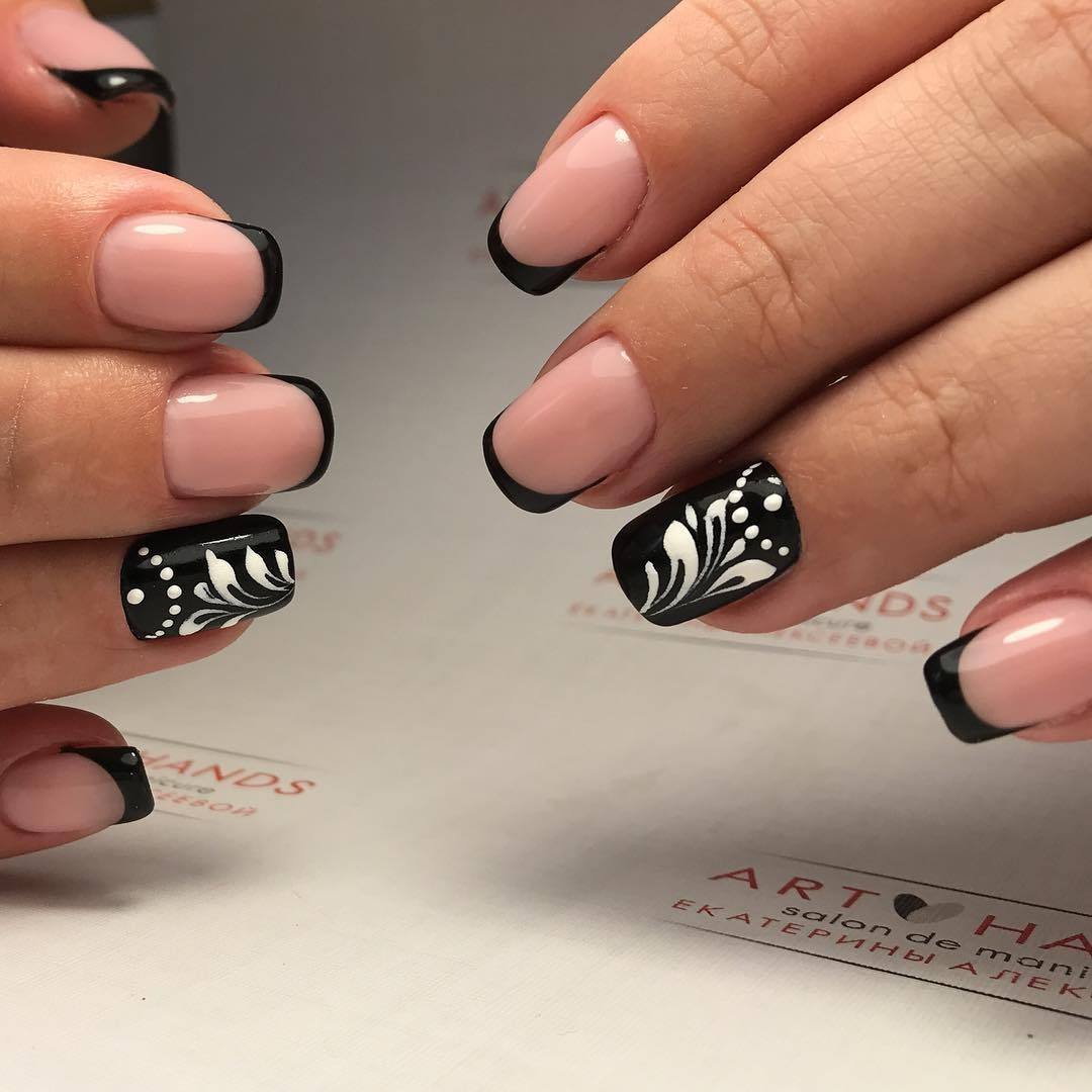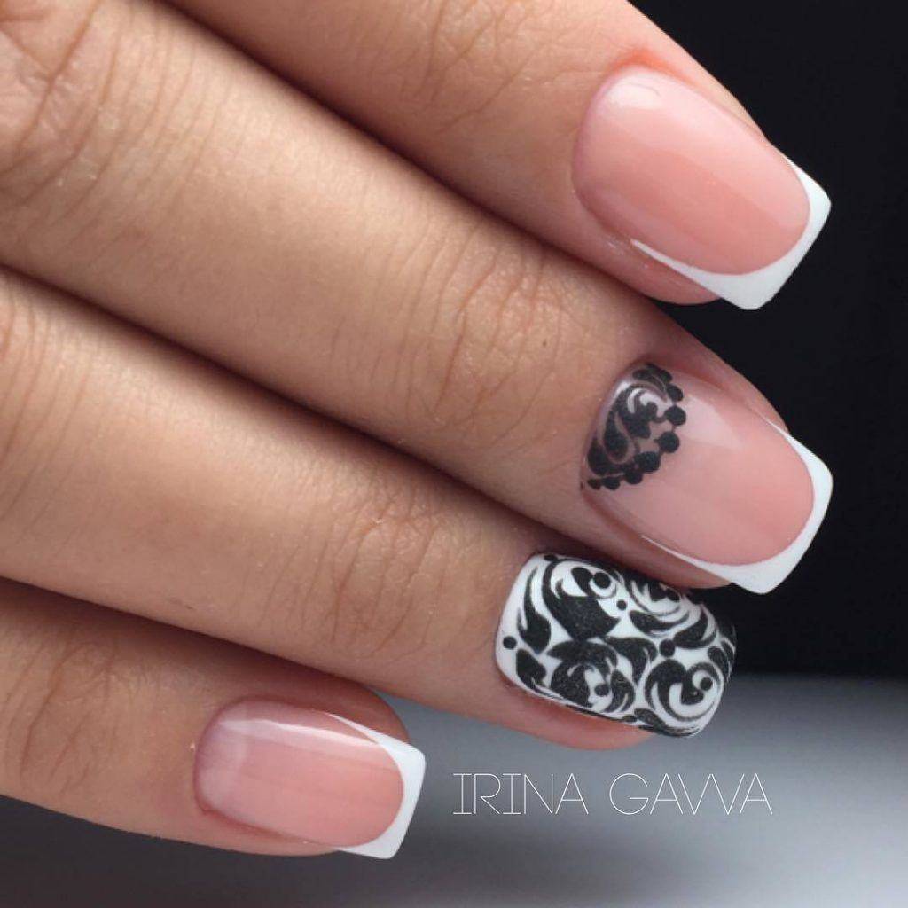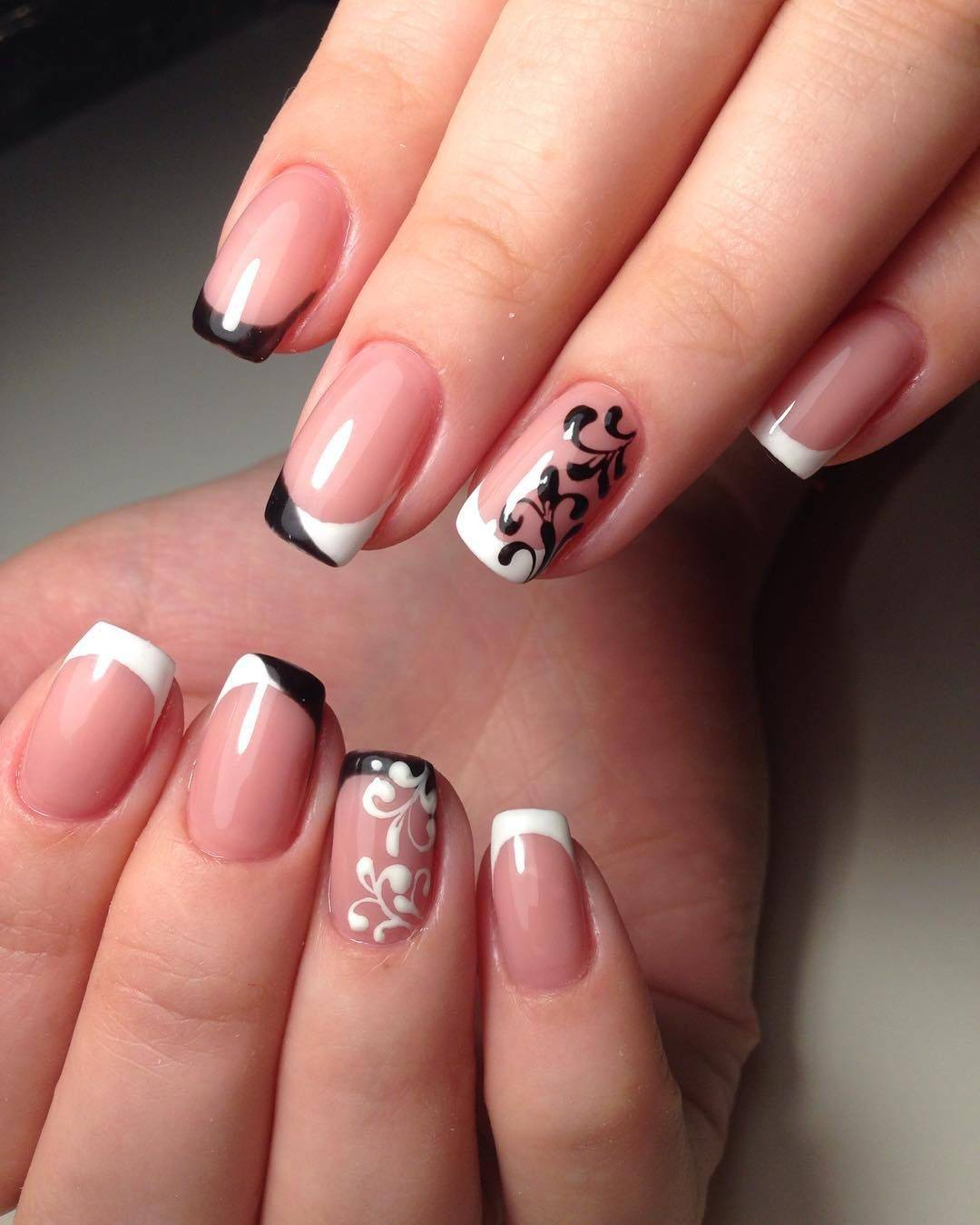 Черно-белый френч на ногтях подойдет настоящим почитательницам винтажного стиля, а также смелым девушкам. Им следует выбирать кружевной рисунок с аристократичными завитушками. Чтобы маникюр выглядел необычно, можно накрасить белым лаком указательный и безымянный пальцы, а остальные черным, или наоборот.