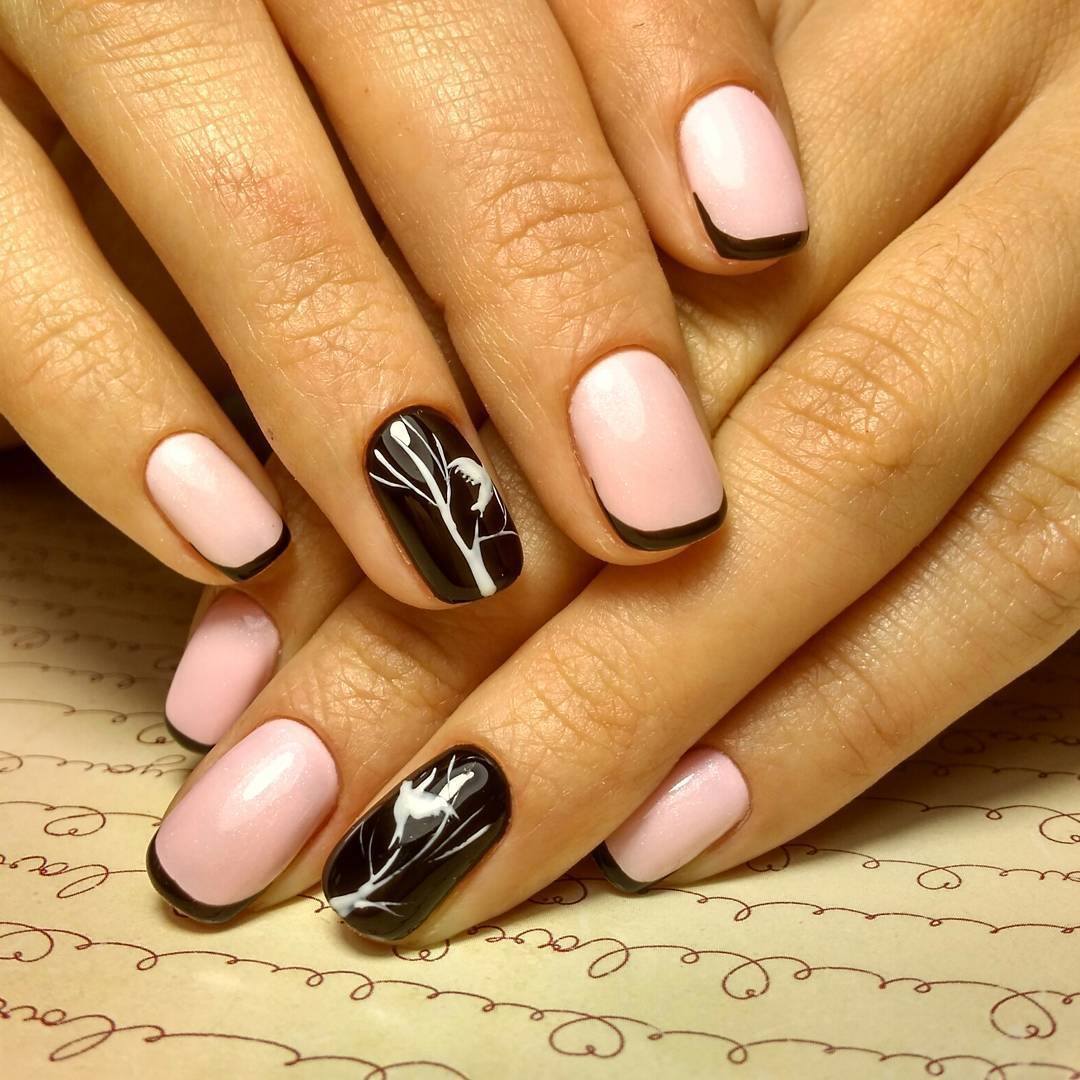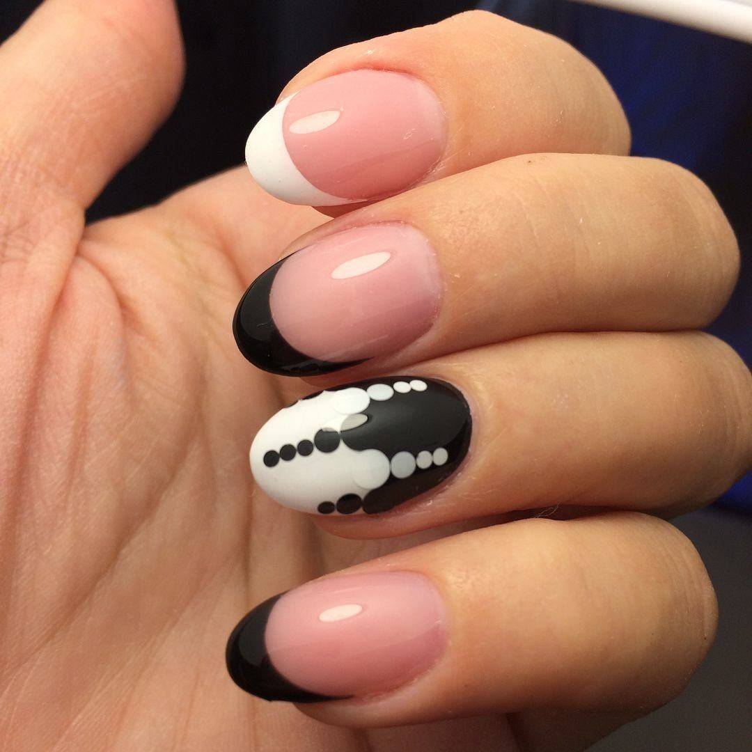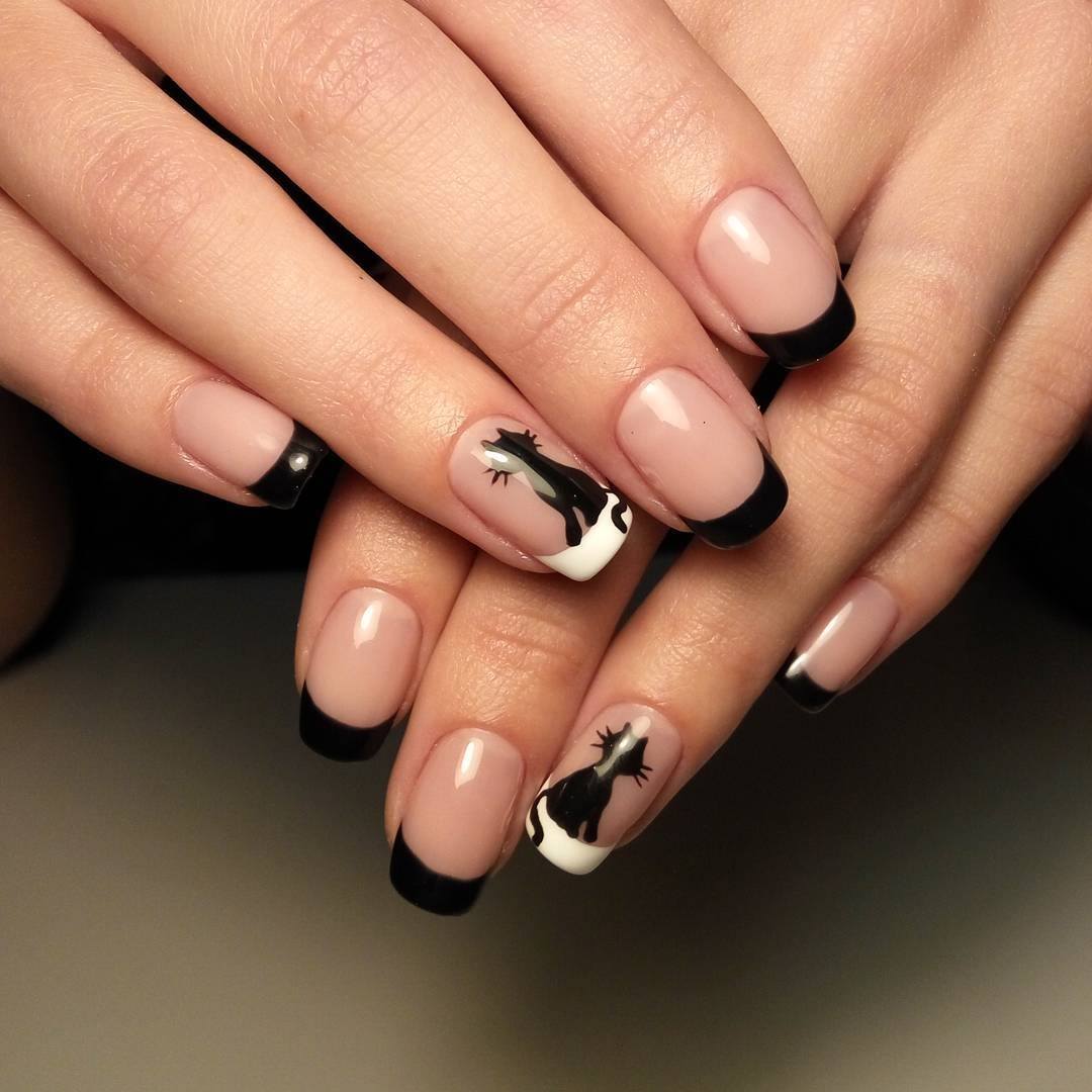 Чёрный френч с лунным маникюром становится всё более популярным. В тренде — контраст, где чёрный превалирует. Лунку можно выполнить в светлых тонах. Техника больше подходит для длинных ногтей, поскольку визуально она укорачивает ногтевую пластину.