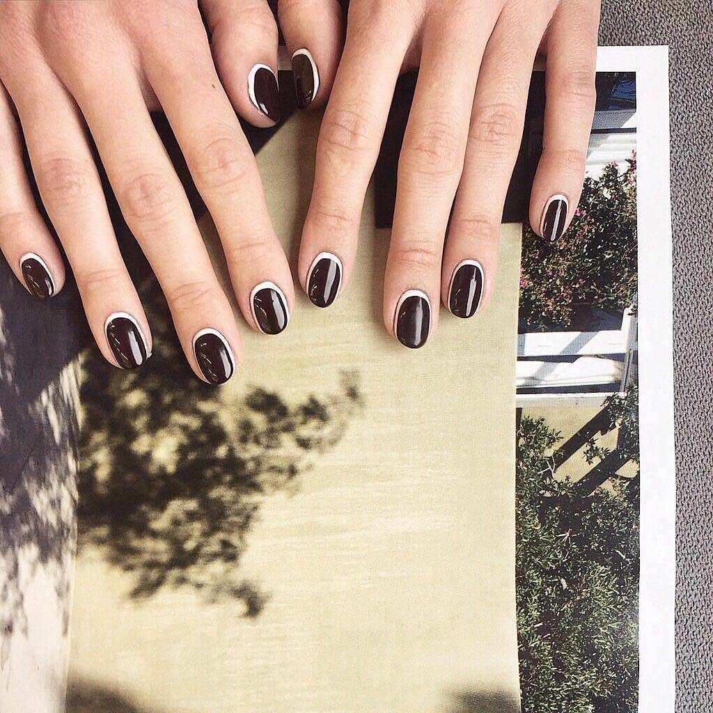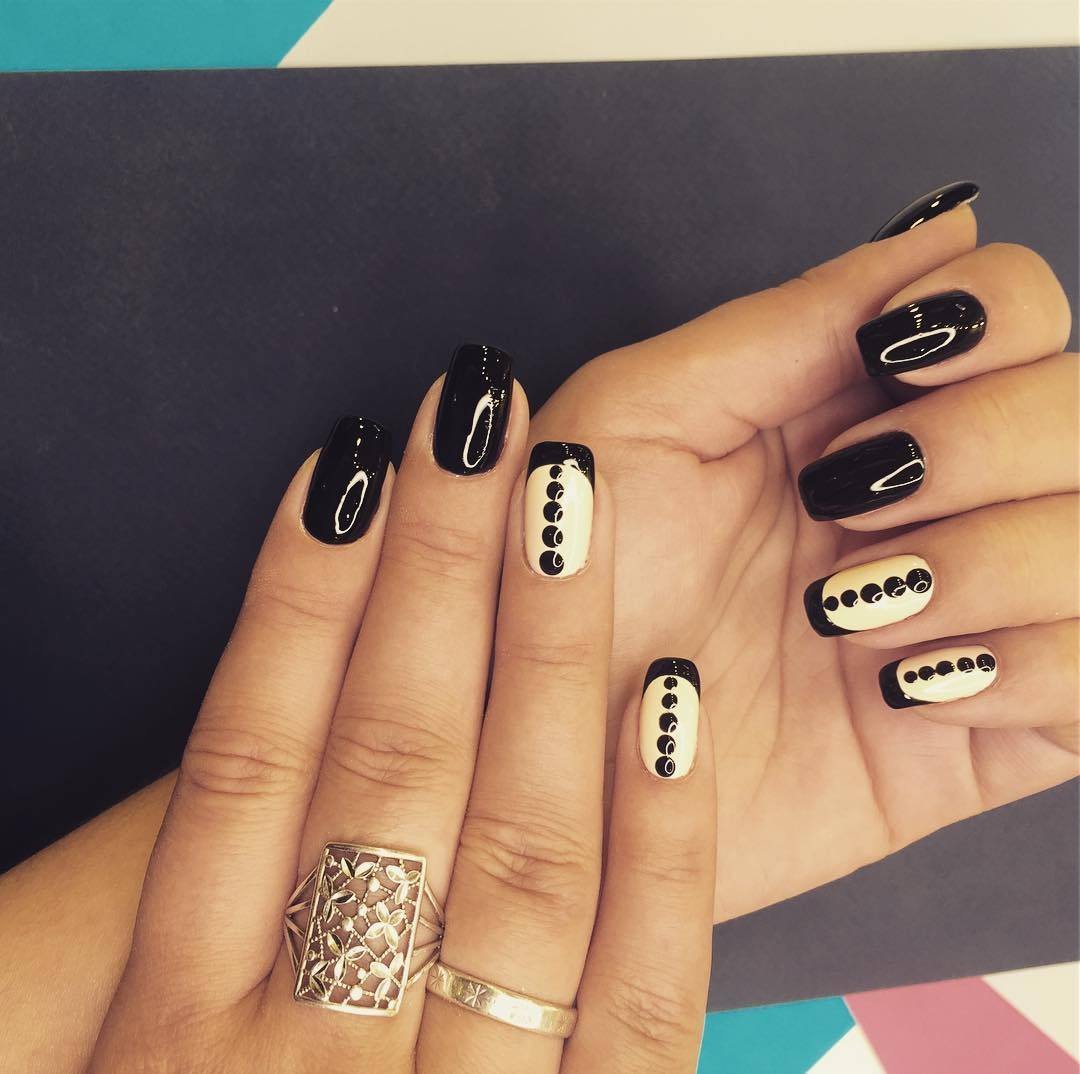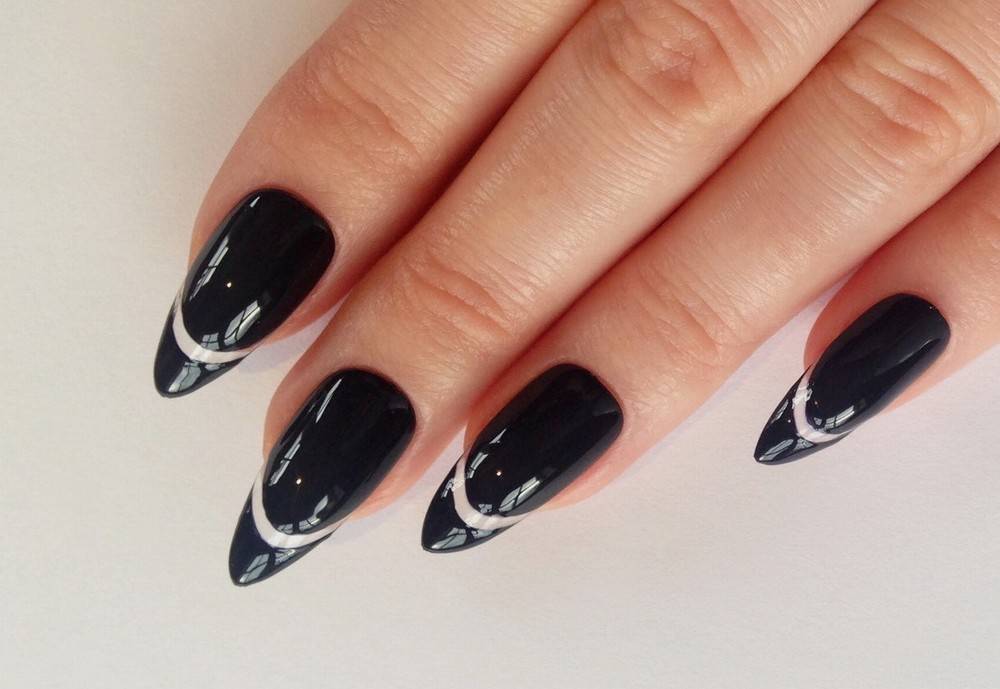 Чёрный френч с лунным маникюром становится всё более популярным. В тренде — контраст, где чёрный превалирует. Лунку можно выполнить в светлых тонах. Техника больше подходит для длинных ногтей, поскольку визуально она укорачивает ногтевую пластину.