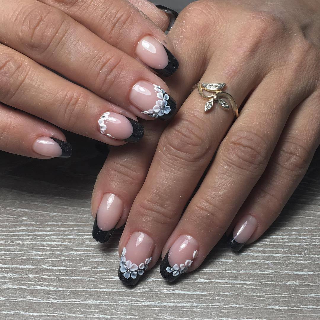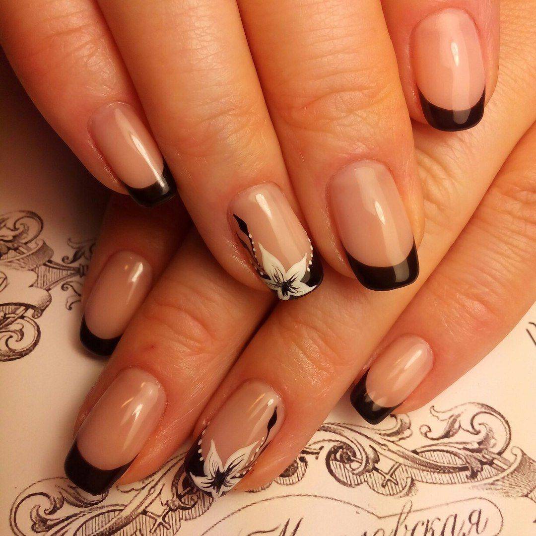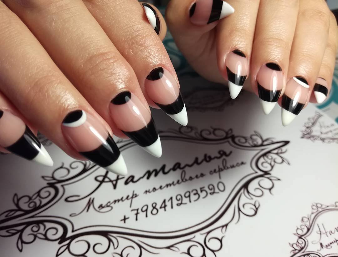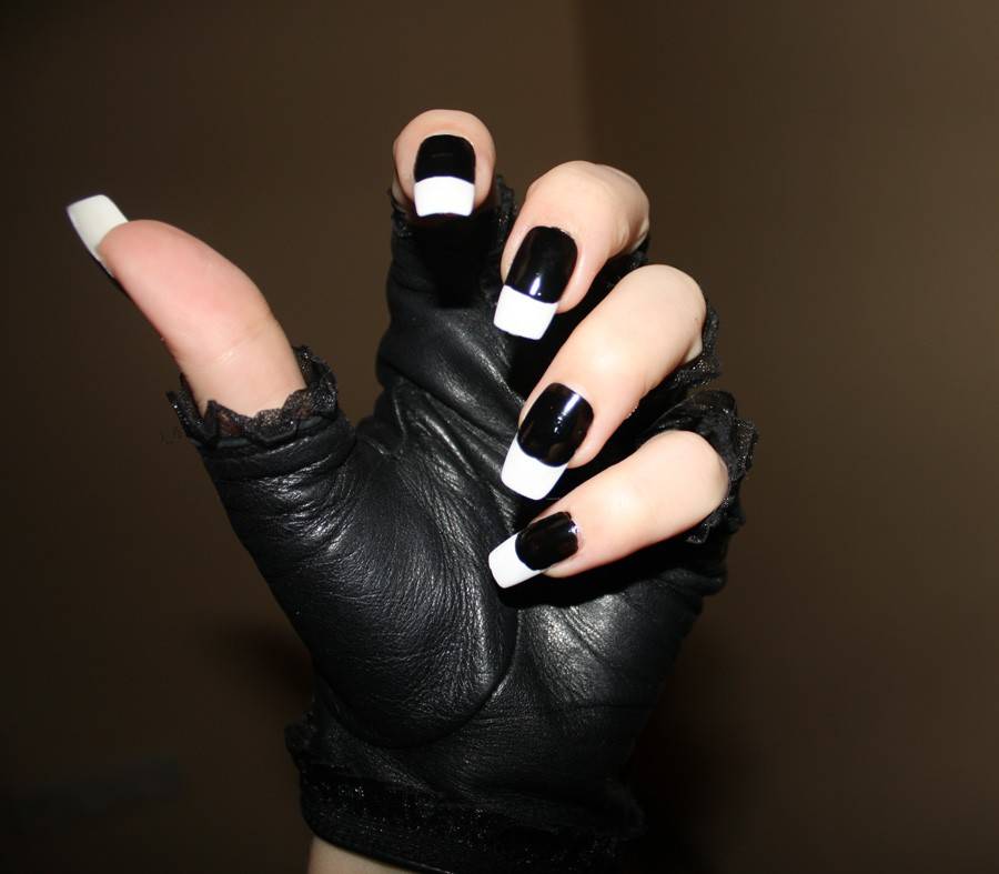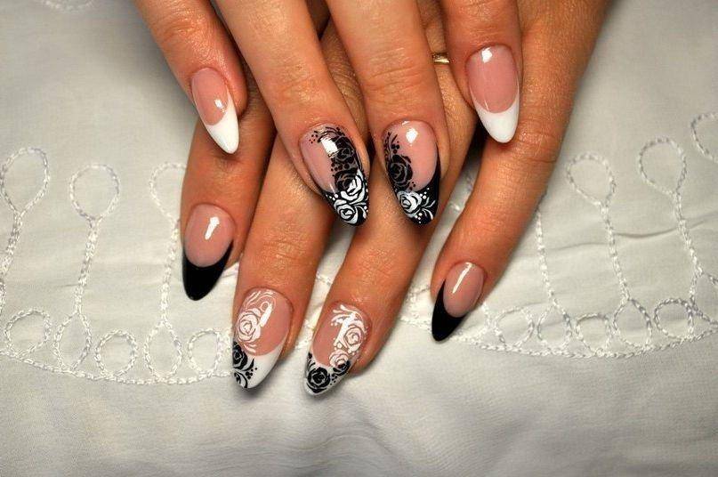 Счастливым обладательницам длинных ноготков очень повезло, ведь у них есть масса вариантов для выполнения черно-белого френча. Здесь можете полностью отдаться своей фантазии, ведь на длинных ноготках очень просто нарисовать роскошные рисунки. Сделать это можно как на черной, так и белой основе френча. Можно даже на прозрачной основе сделать черную улыбку и украсить ее нежными белыми цветами. Чтоб выполнить маникюр сложнее, нанесите линии улыбочки белого цвета на всех ноготках, кроме среднего и безымянного. На них улыбка должна быть черной. А теперь на этих ноготках необходимо выполнить шикарный рисунок черного цвета. Это может быть флористические мотивы, геометрия или большой рисунок. Все зависит от желания девушек.