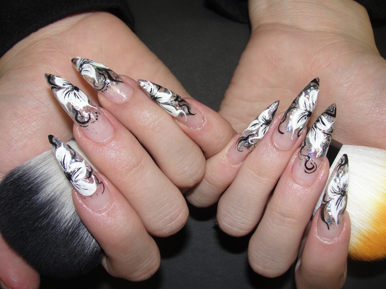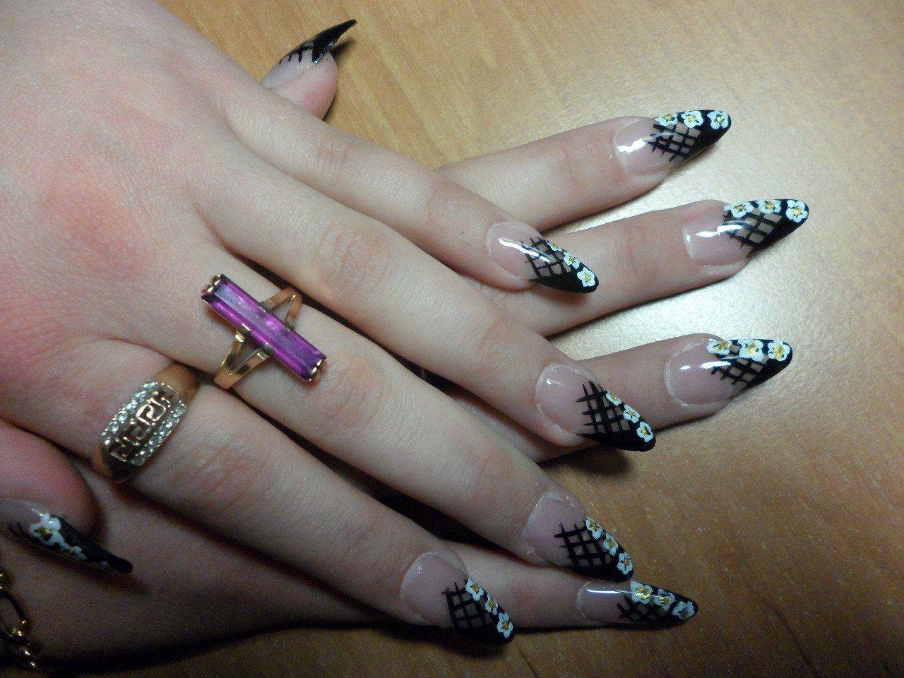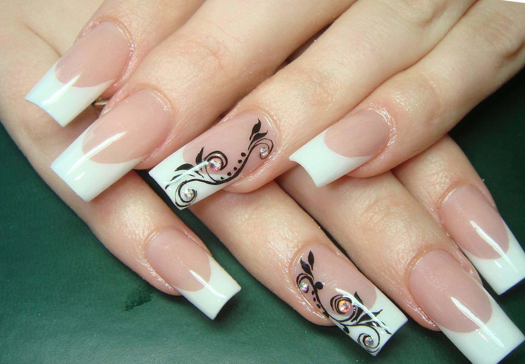Счастливым обладательницам длинных ноготков очень повезло, ведь у них есть масса вариантов для выполнения черно-белого френча. Здесь можете полностью отдаться своей фантазии, ведь на длинных ноготках очень просто нарисовать роскошные рисунки. Сделать это можно как на черной, так и белой основе френча. Можно даже на прозрачной основе сделать черную улыбку и украсить ее нежными белыми цветами. Чтоб выполнить маникюр сложнее, нанесите линии улыбочки белого цвета на всех ноготках, кроме среднего и безымянного. На них улыбка должна быть черной. А теперь на этих ноготках необходимо выполнить шикарный рисунок черного цвета. Это может быть флористические мотивы, геометрия или большой рисунок. Все зависит от желания девушек.