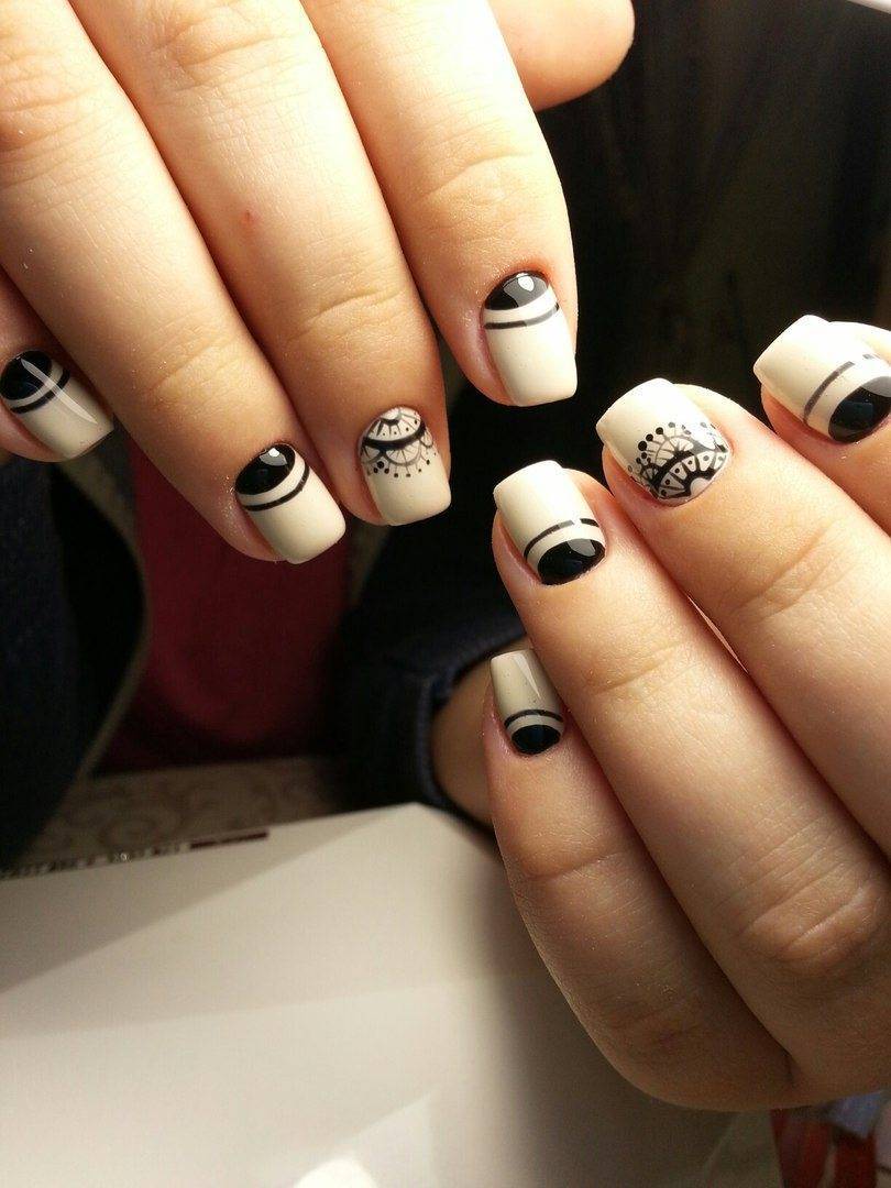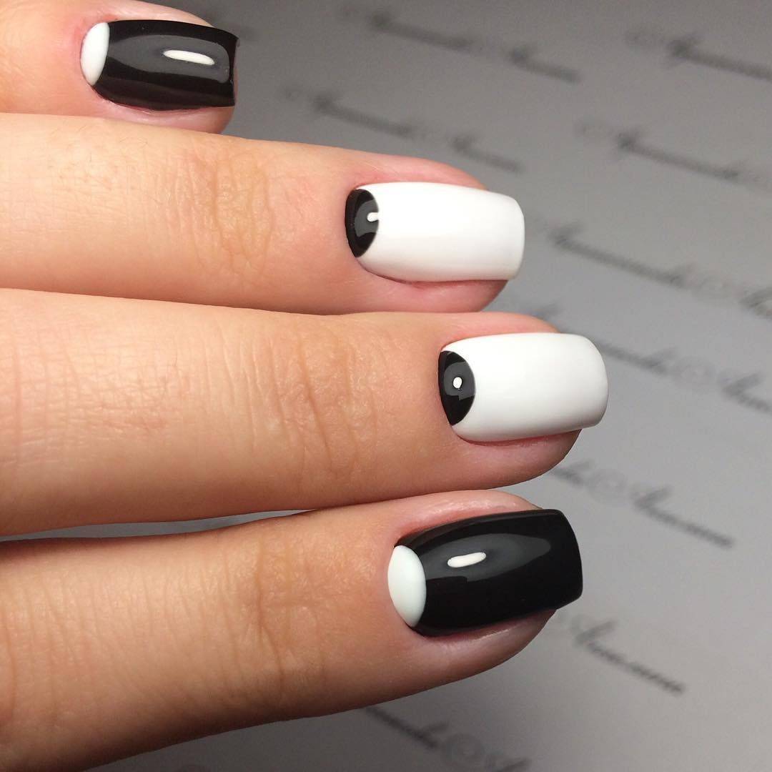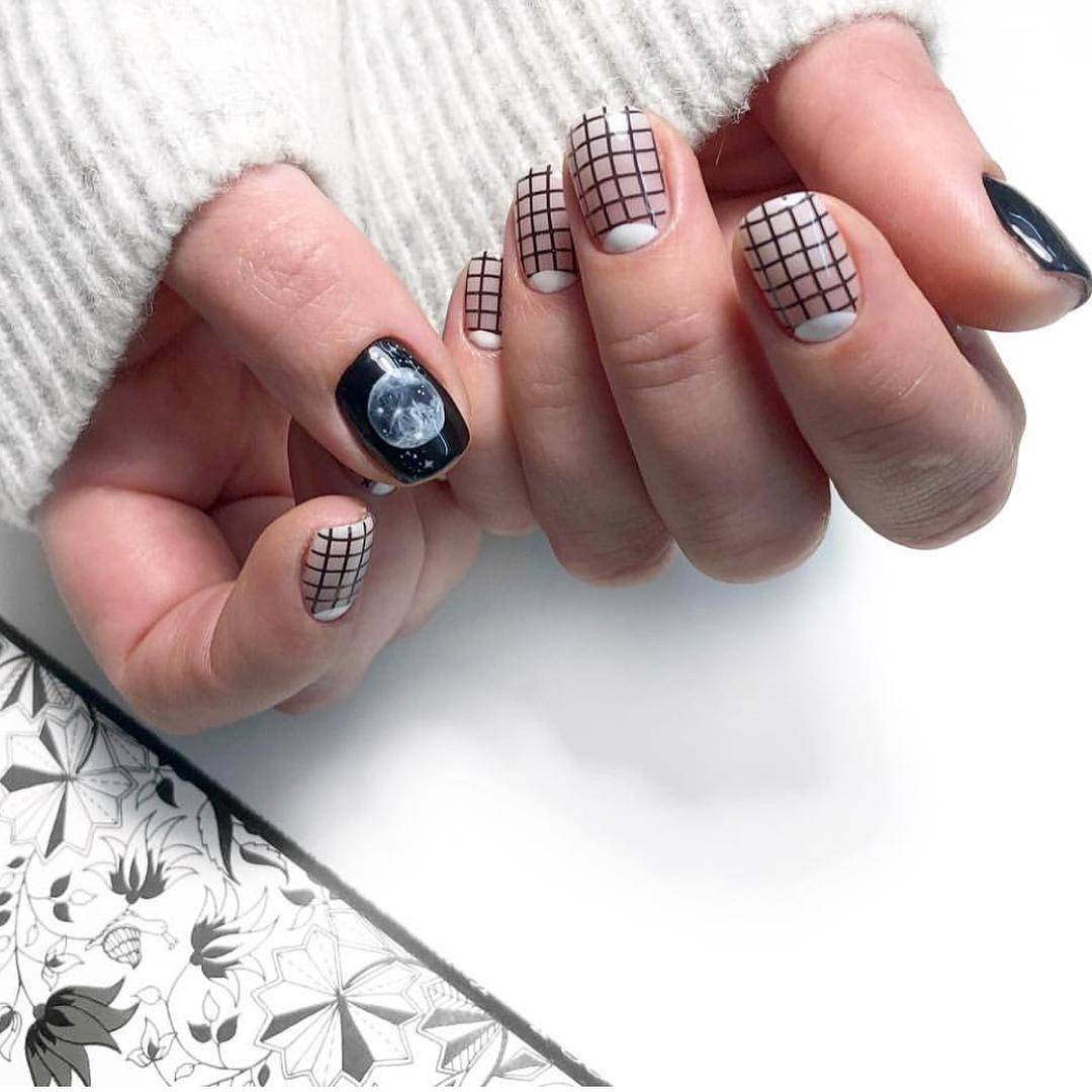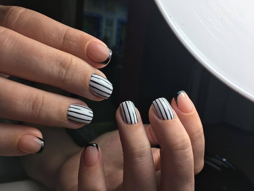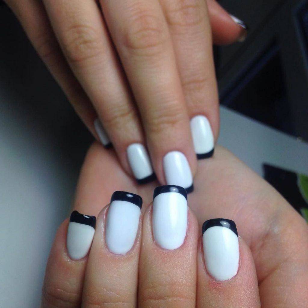 На средние и короткие ногти следует нанести белую вуаль. Такое решение позволит зрительно увеличить их размер. Белые узоры можно разбавить небольшими рисунками черного цвета.