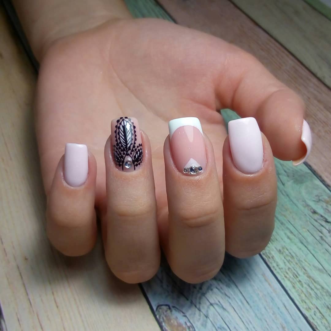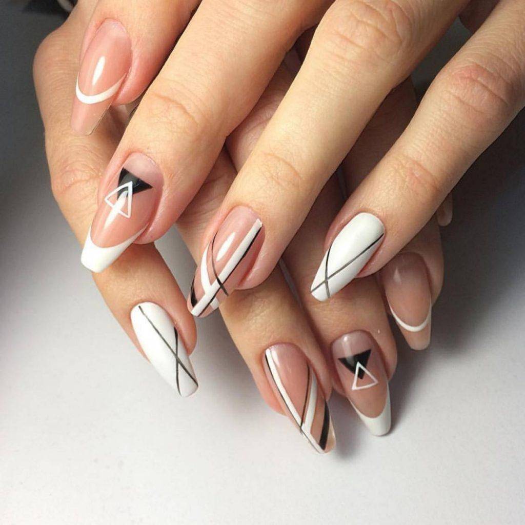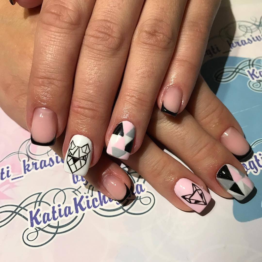 С помощью асимметрии легче создать оригинальный стиль, аналога которому будет не найти. Для её создания преимущественно используют скошенные линии. Это может быть улыбка или произвольный зигзаг. Такой френч великолепен в дизайне с чёрно-белым мрамором или с геометрией. Главное — сочетаемость с другими элементами образа.
