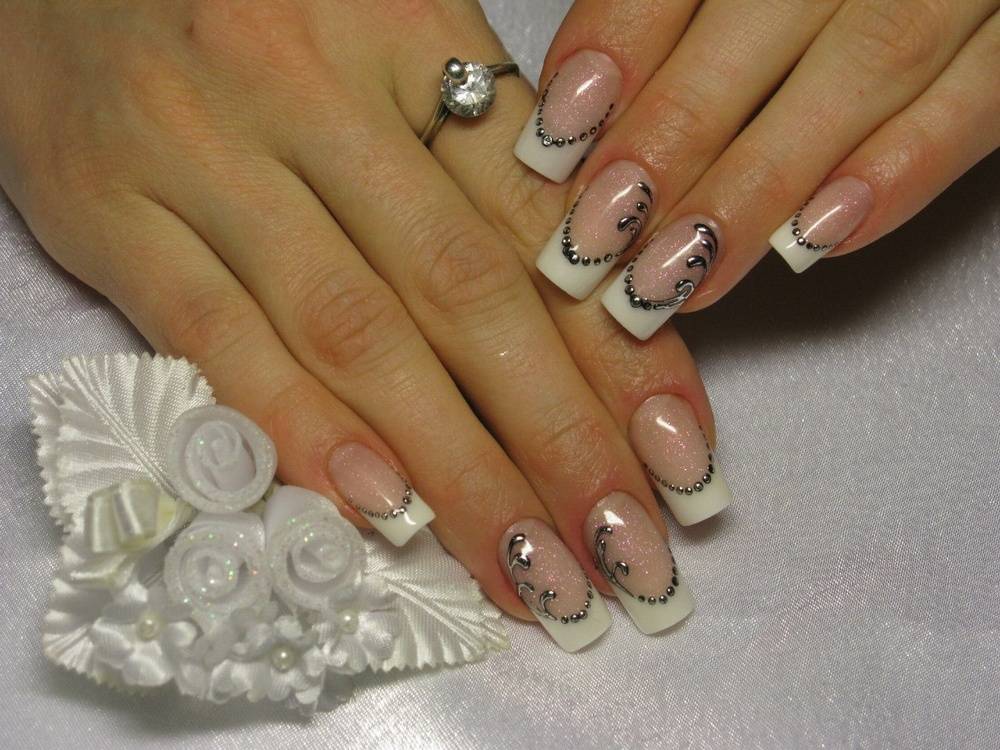 При выборе такого дизайна, как французский маникюр с оформлением свободного ногтевого края, часть пальцев можно оформить одного цвета, а по краю ногтя остальных пальцев – другого. Украшение из бусинок и камешков, сделает Ваш маникюр более необычным.