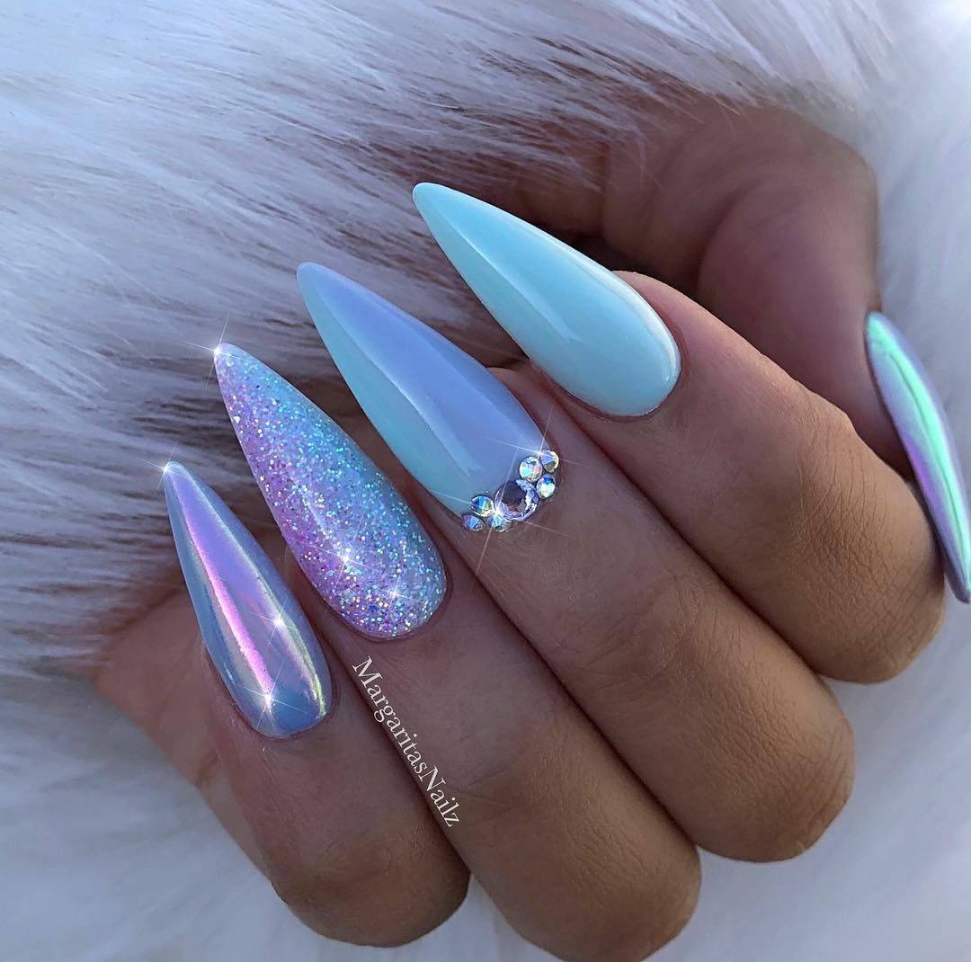 Каждый мастер индивидуально подбирает размер и расцветку камней в зависимости от основного оттенка гель-лака, длины ногтей и предпочтений самой модели. Какие бы камни, оттенки или декор вы ни выбрали, стоить помнить, что на острых ногтях нужно придерживаться стиля минимализм, чтобы не получить вульгарный и вызывающий дизайн.