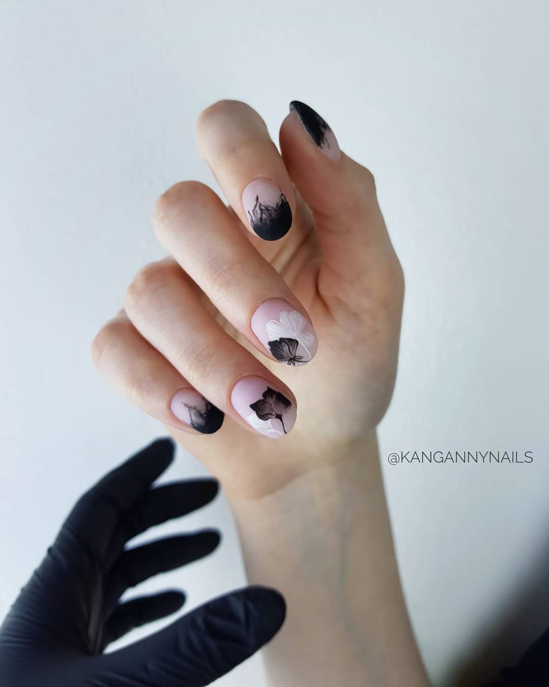 Лучше всего выполнять небольшие цветочки или бутончики, и тогда маникюр будет выглядеть красиво и утонченно. Можно выполнить прекрасные цветочки на одном или нескольких пальчиках вместо линии улыбки или покрыть цветочными мотивами всю ногтевую пластину.