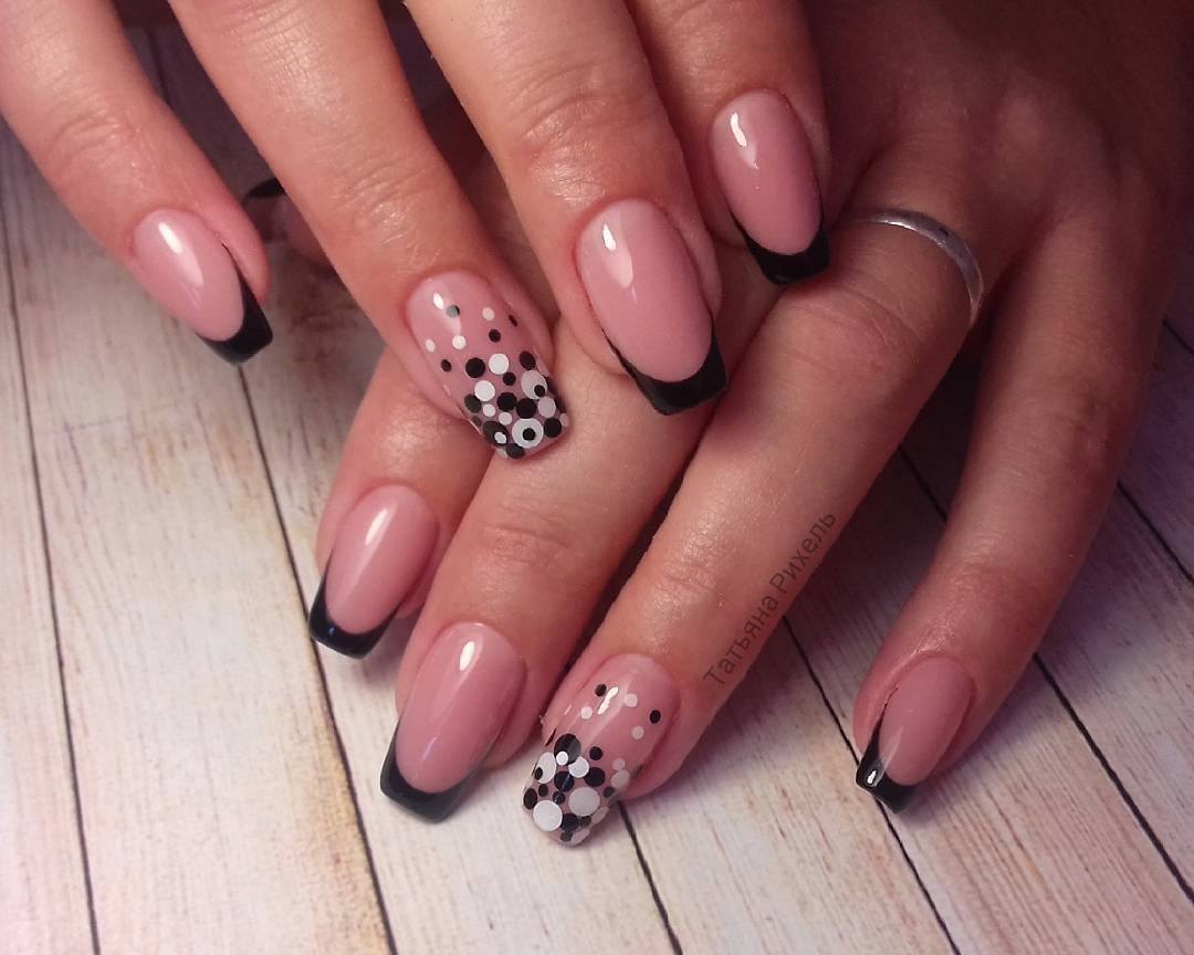 Чёрный френч со стразами призван завершить шикарный образ. Дизайн будет удачным, если не переборщить с камнями. Здесь особенно важна мера. Для такого дизайна берут исключительно качественный материал, поскольку чёрный цвет способен обнажить любой изъян.