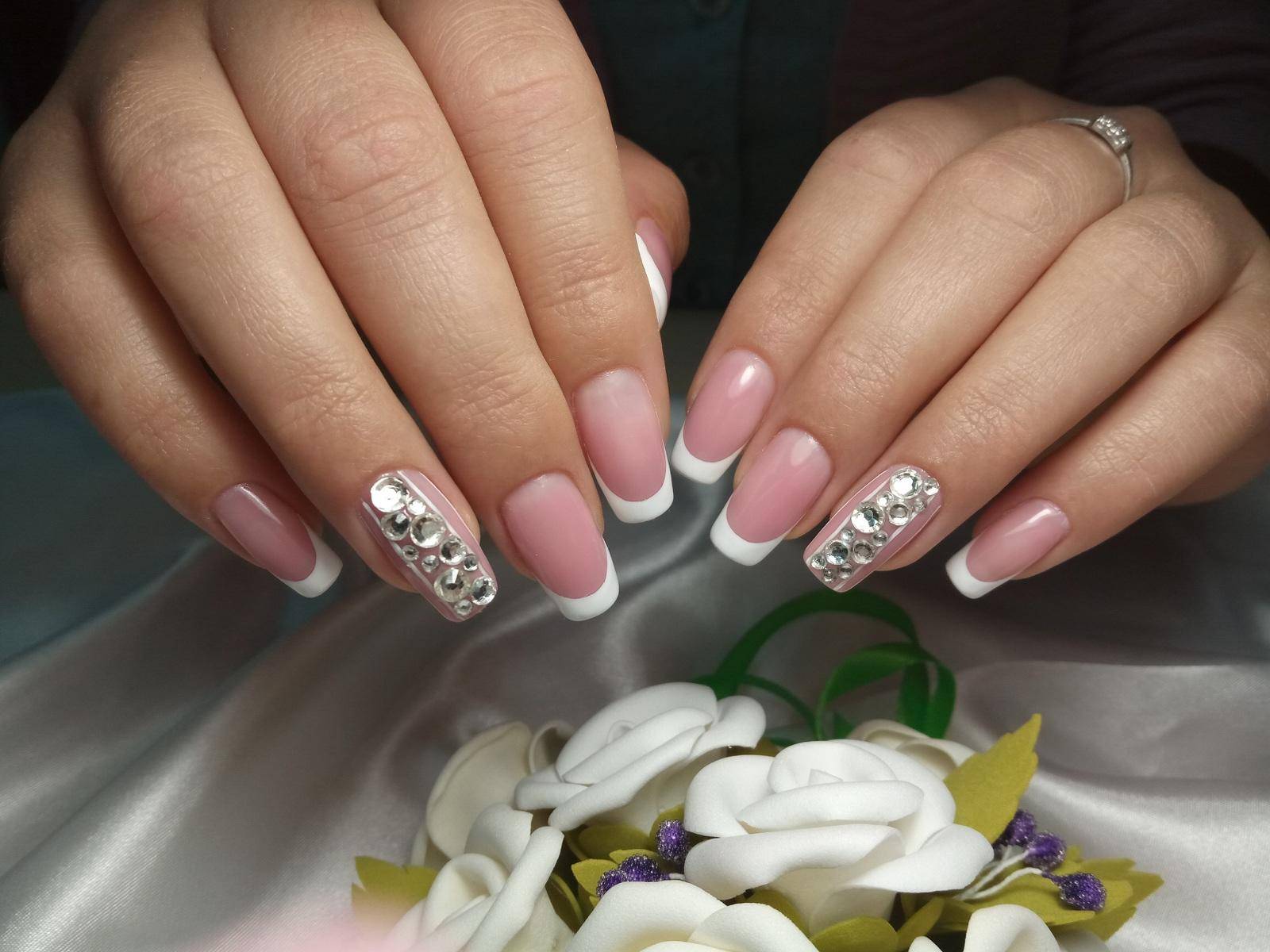 Френч невесты, выполненный в пастельных тонах, а также со стразами или цветочным декором, выглядит нежно и романтично. Если добавить немного страз на безымянный палец, то они подчеркнут красоту обручального кольца.