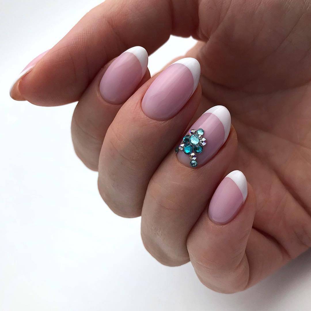 В этом виде френча главное — не переборщить с количеством камушков. Лучше украшать отдельные ногти — например, по краю лунки либо в центре ноготка, выложив узор. Также кристаллики можно сделать частью художественной композиции на безымянном пальце.