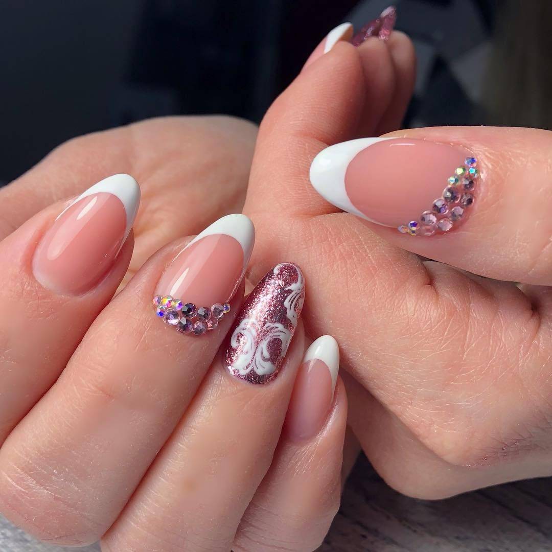 Белый гель-лак используется для прорисовки края ногтевой пластины. Остальное пространство ногтя можно украсить любым декором. Выбор зависит от длины ногтей и цветовой палитры. На длинных ногтях шикарно выглядит однотонный маникюр, дизайн со слайдерами, стемпингом, стразами. На коротких ногтях можно ограничиться декором бульонками или мелкими камнями.