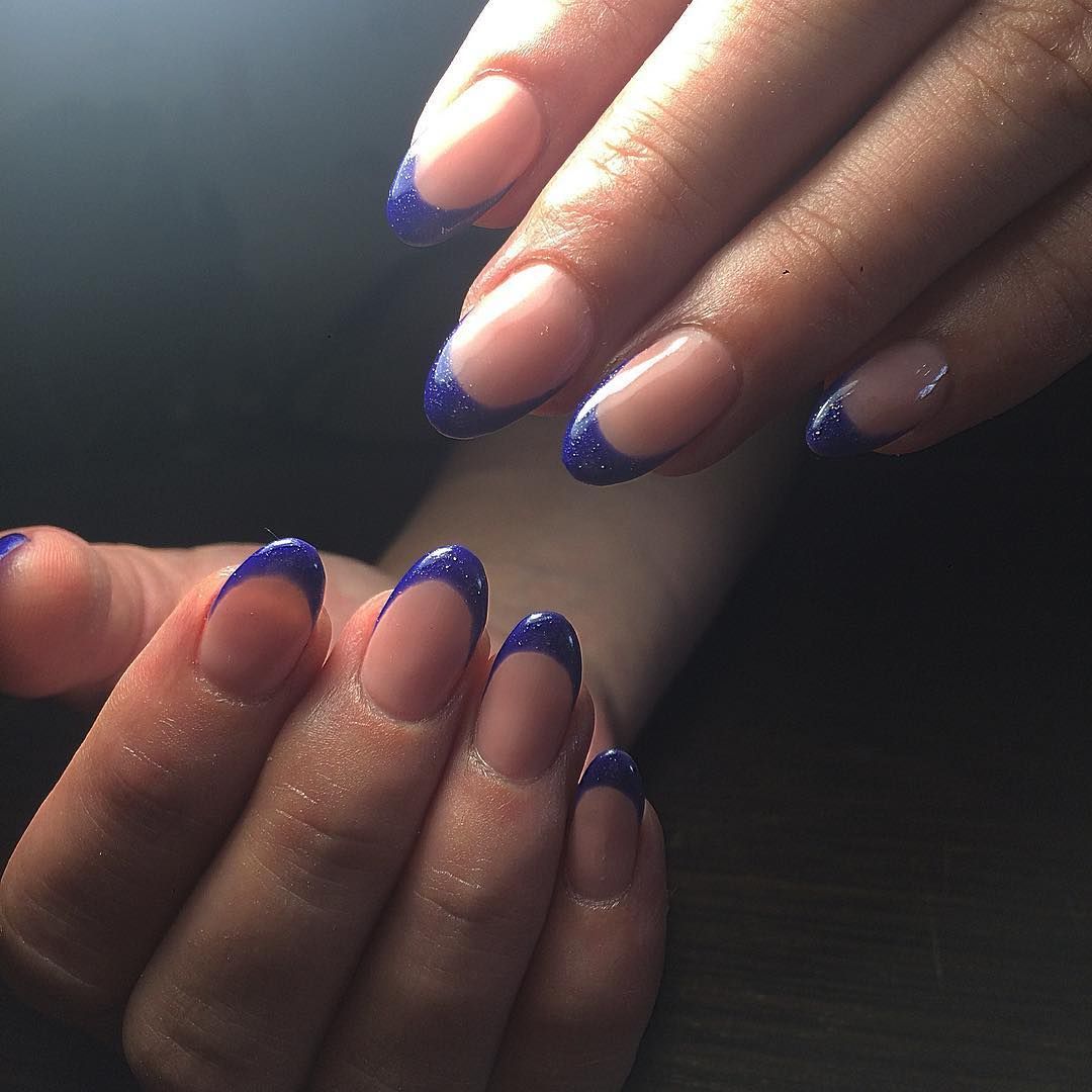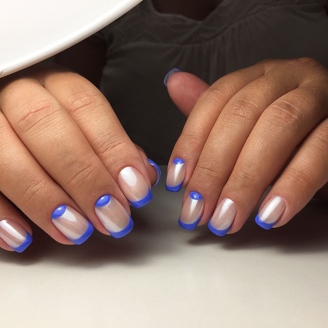 Предпочтительно это классический или лунный французский маникюр в голубых пастельных тонах, с аквариумным акцентом на нескольких пальцах.