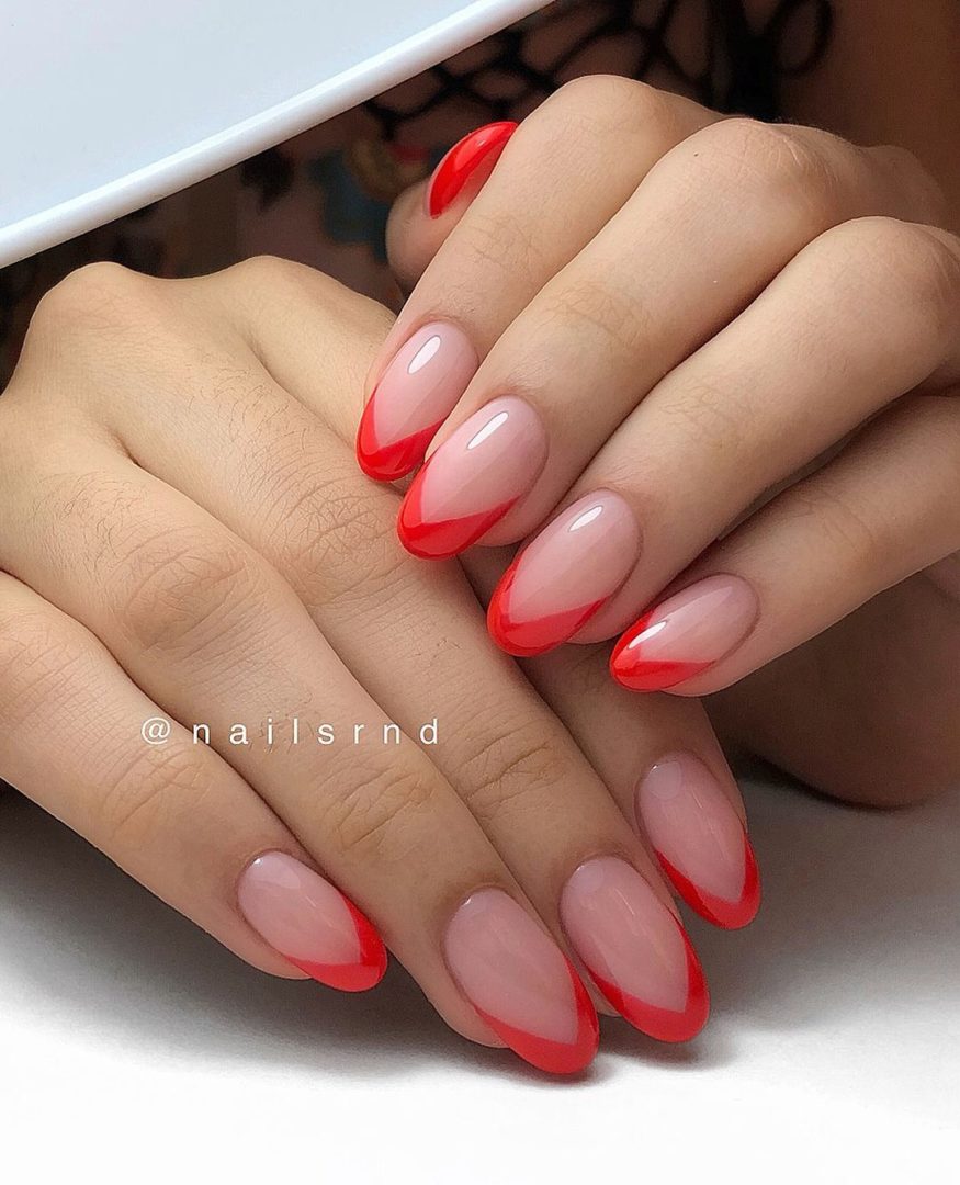 Миндалевидные ноготки сужаются к концу ногтевой пластины. При этом угол не должен быть слишком острым. Для такой формы не желательно использовать слишком светлые тона французского маникюра. Так как они визуально «съедают» заостренную часть, и ноготь может казаться обрубленным, а маникюр не законченным. Миндалевидную форму лучше обыгрывать яркими полосами, темных оттенков и не слишком яркими стразами.