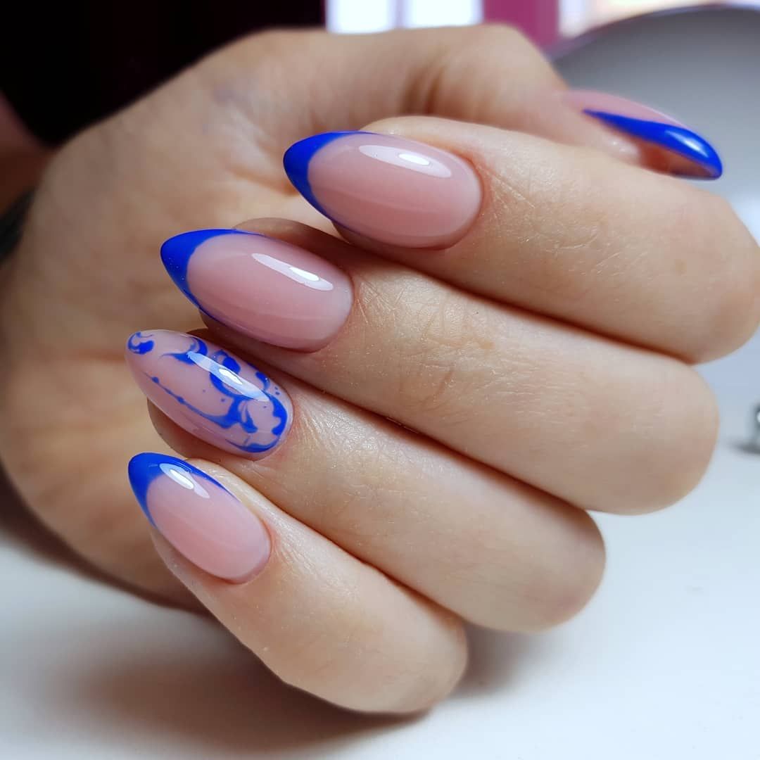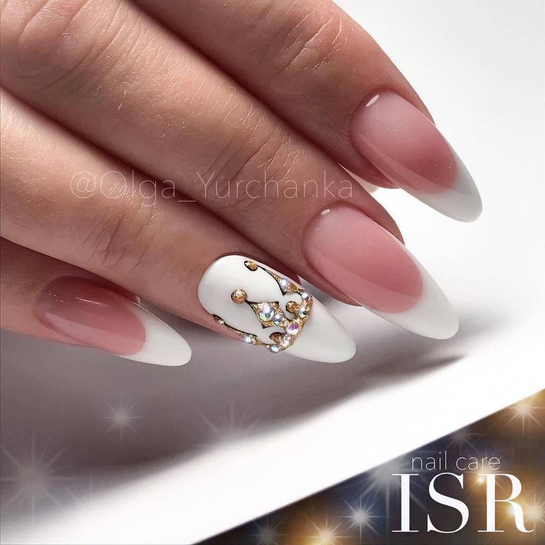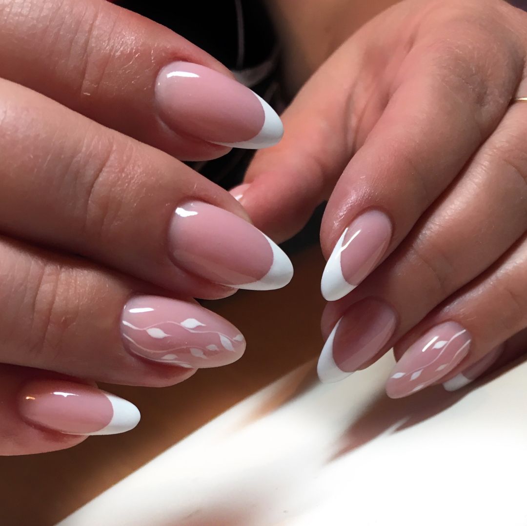 Очень красиво и празднично смотрится френч на длинных миндалевидных ноготках.