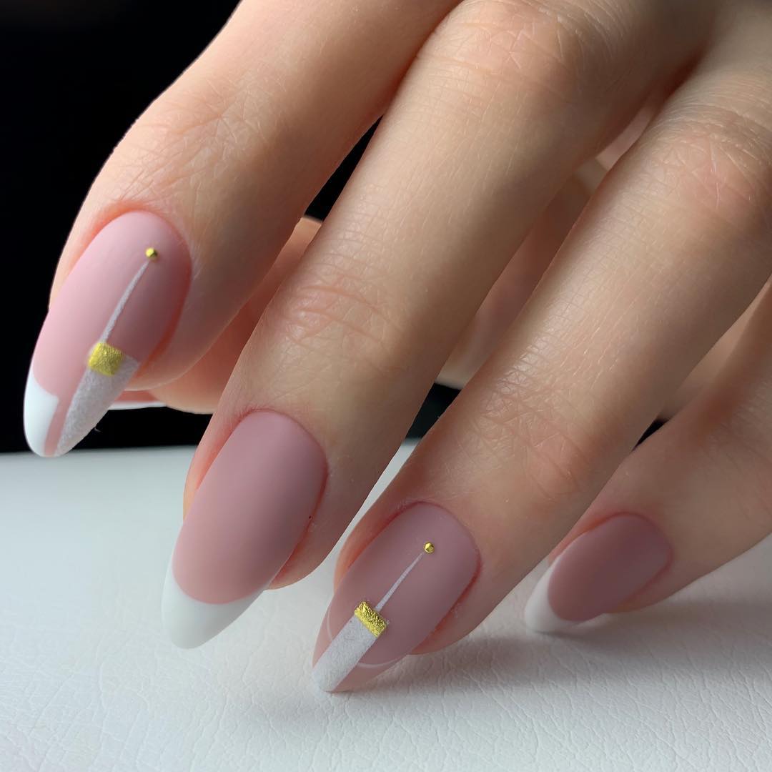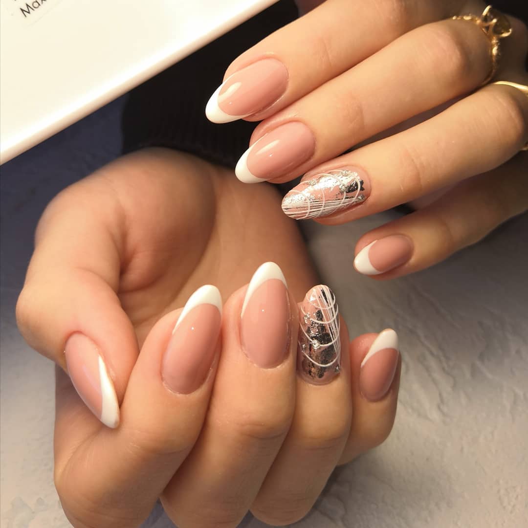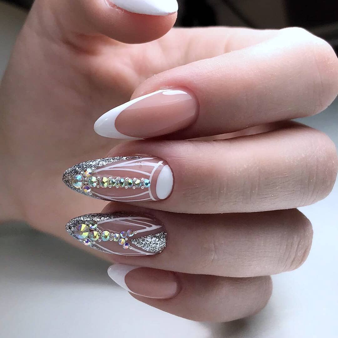 Очень современно и оригинально будет выглядеть блестящий французский маникюр на длинных острых ноготках или на ноготках формы балерина.