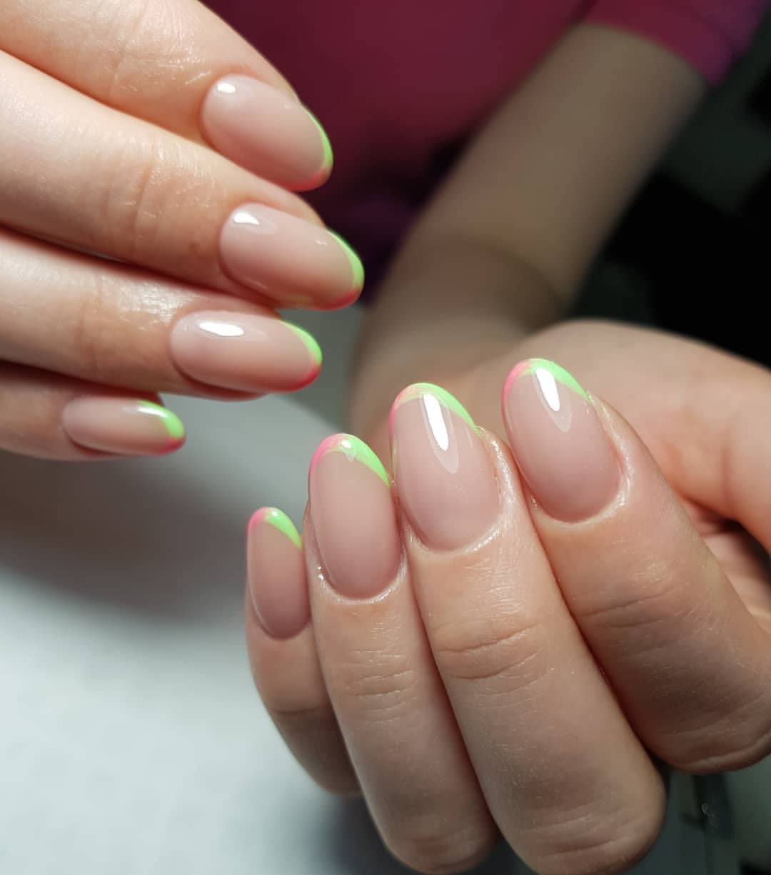 Французский маникюр с ярким лаком для ногтей – довольно очевидное решение для лета. Однако если вы не являетесь поклонницей таких лаков (в отличие от ярких), попробуйте вариант омбре. Узкая маникюрная кисть может помочь!